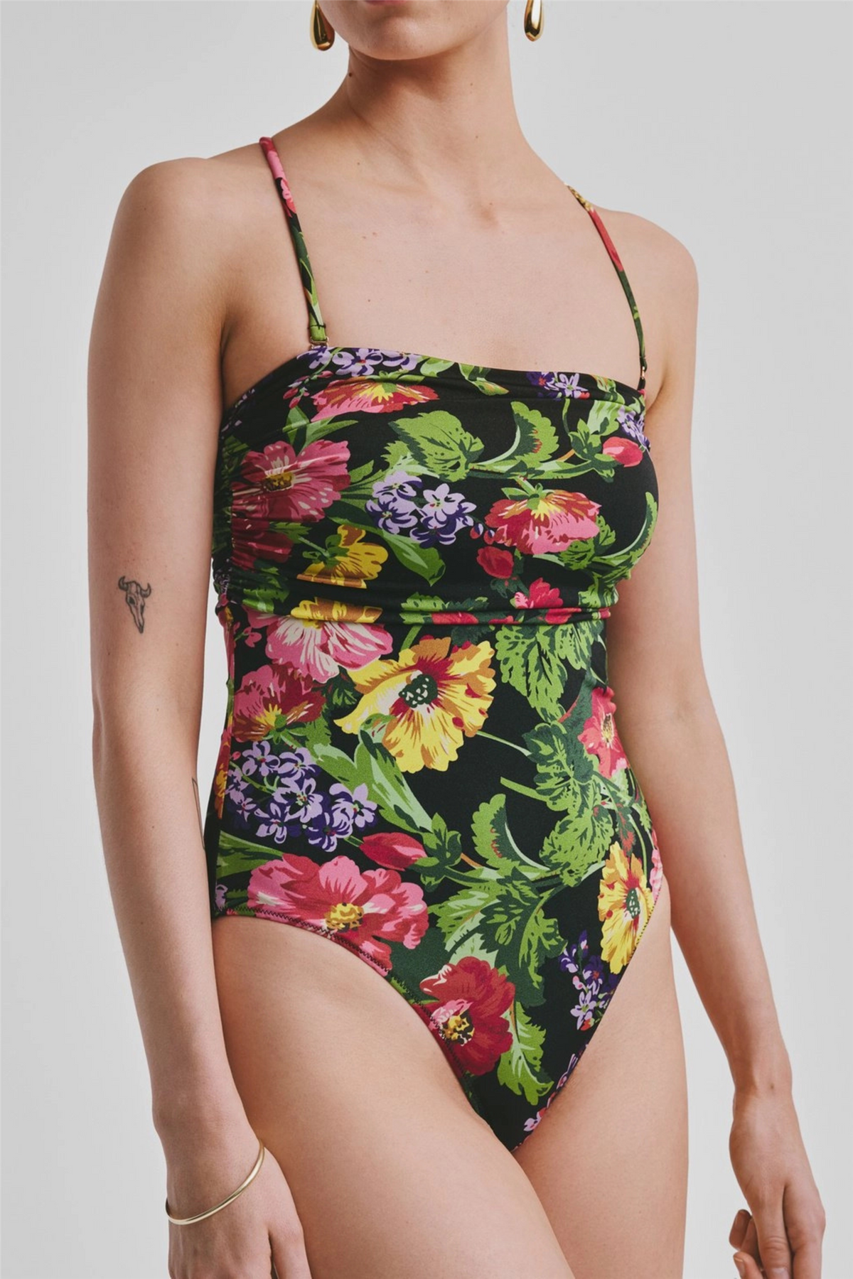 Bandeau Badedrakt fra byTiMo er en flatterende badedrakt med et vakkert blomstertrykk. Bandeau Badedrakt har en firkantet utringning og tynne, justerbare skulderstropper som kan festes på ulike måter. Den er laget i byTiMos GRS-sertifiserte kvalitet og har behagelig stretch. Perfekt for en dag på stranden – eller som en stilig body til skjørt eller bukse.