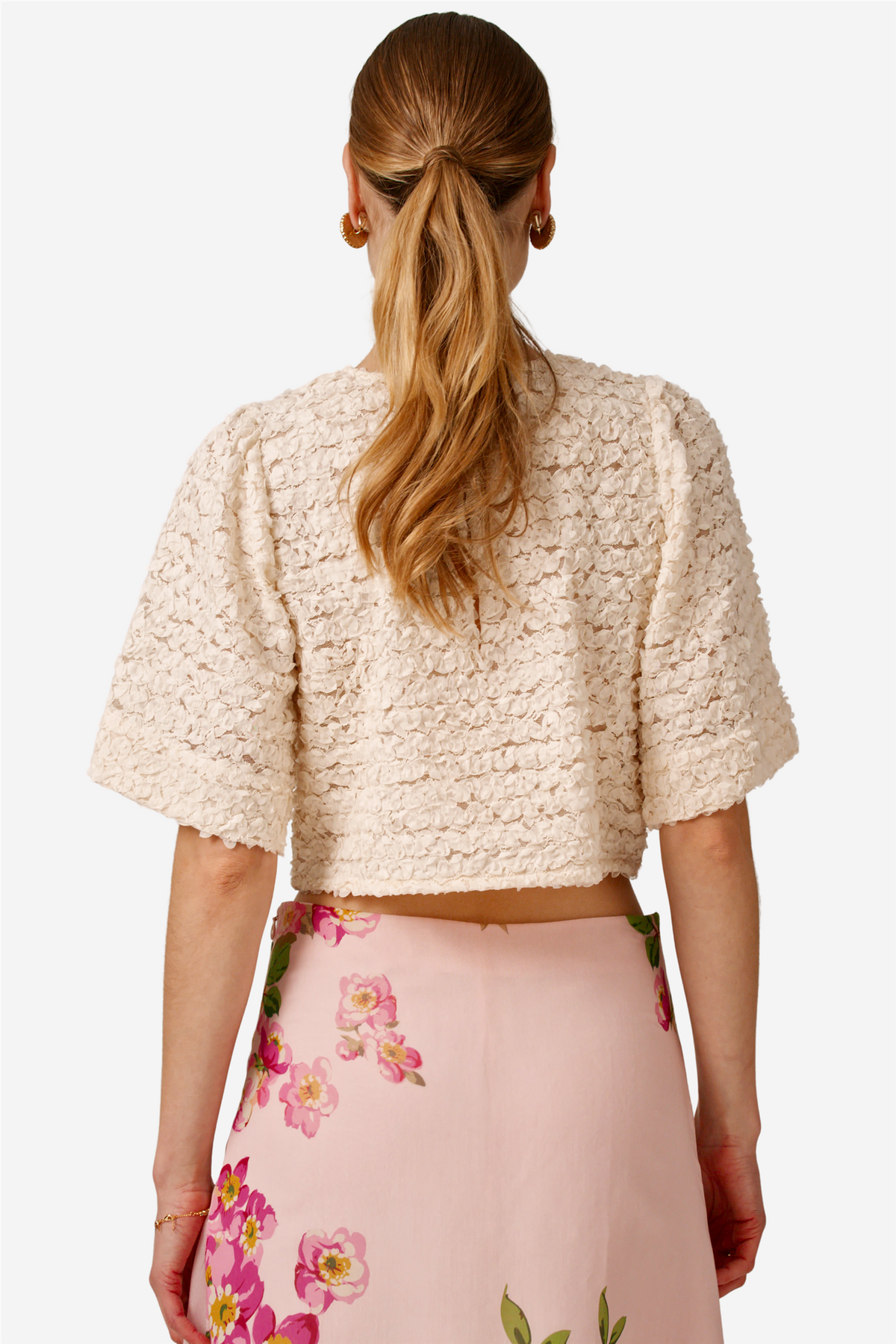 Lace Blouse Vintage fra byTimo. Lace-blusen er laget i vårt transparente, delikate viskosemateriale. Blusen har en avslappet passform, korte firkantede ermer, rund hals og er dekorert med vakre volangdetaljer. Den har en liten åpning i ryggen som lukkes med en knapp.