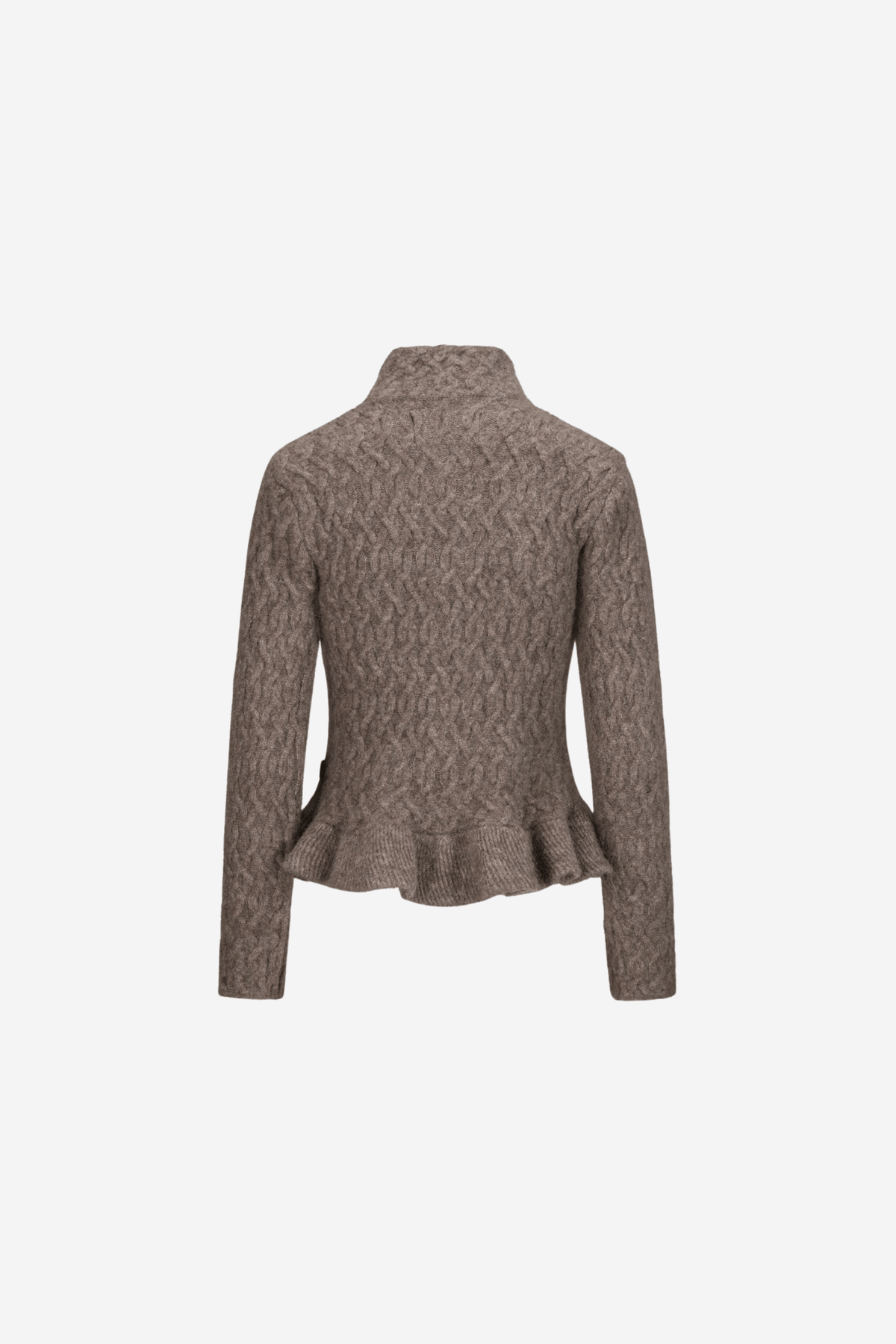 Lene Alpaca Cardigan fra Ella&il. Lene Alpaca Cardigan er et stilfullt og varmt plagg med lange ermer og høy hals. Den har volangdetaljer nederst og intrikate flettemønstre som tilfører tekstur og sjarm. De avtagbare skulderputene gir allsidighet, og den toveis glidelåsen foran øker funksjonaliteten. Denne cardiganen er perfekt for lag-på-lag-antrekk, og kombinerer komfort med et moteriktig uttrykk.