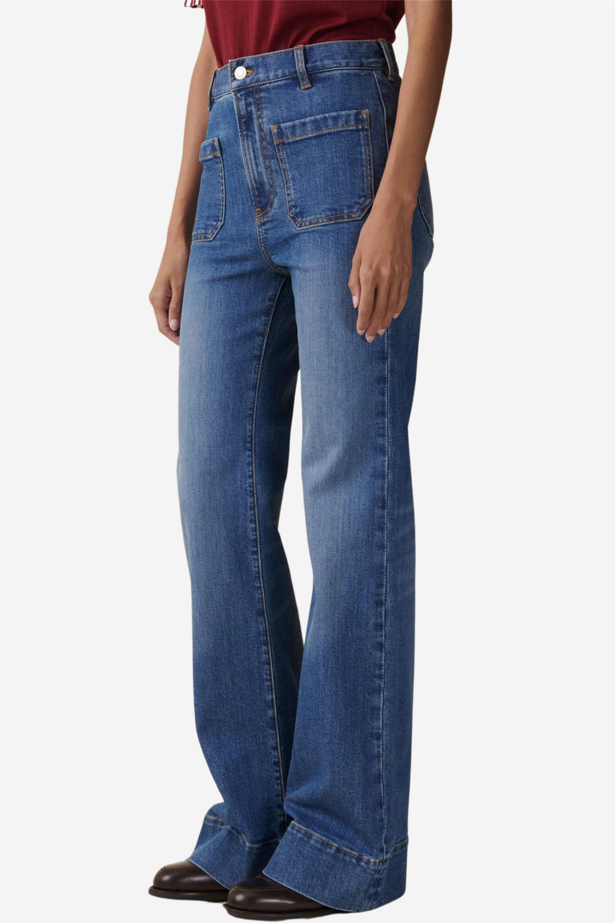 St Monica Brisk Mid Vintage fra Jeanerica. St. Monica er inspirert av sjømannsuniformer fra slutten av 1960-tallet, med påsydde lommer, sleng og brede falder. Jeansene har gylf med glidelås, høyt liv og vide ben. Laget i mykt falmet blå økologisk denim med Jeanericas signaturstretch, som gir varig fleksibilitet. Fullført med klassiske tobakkfargede sømmer.
