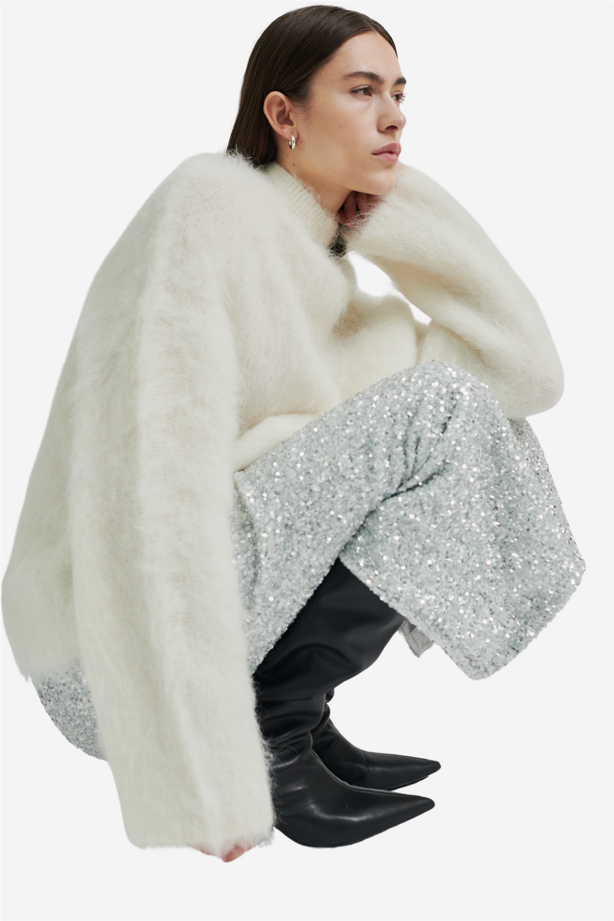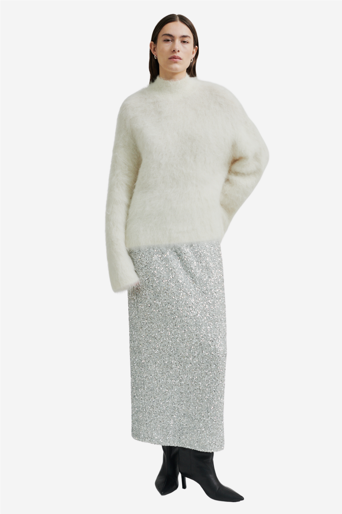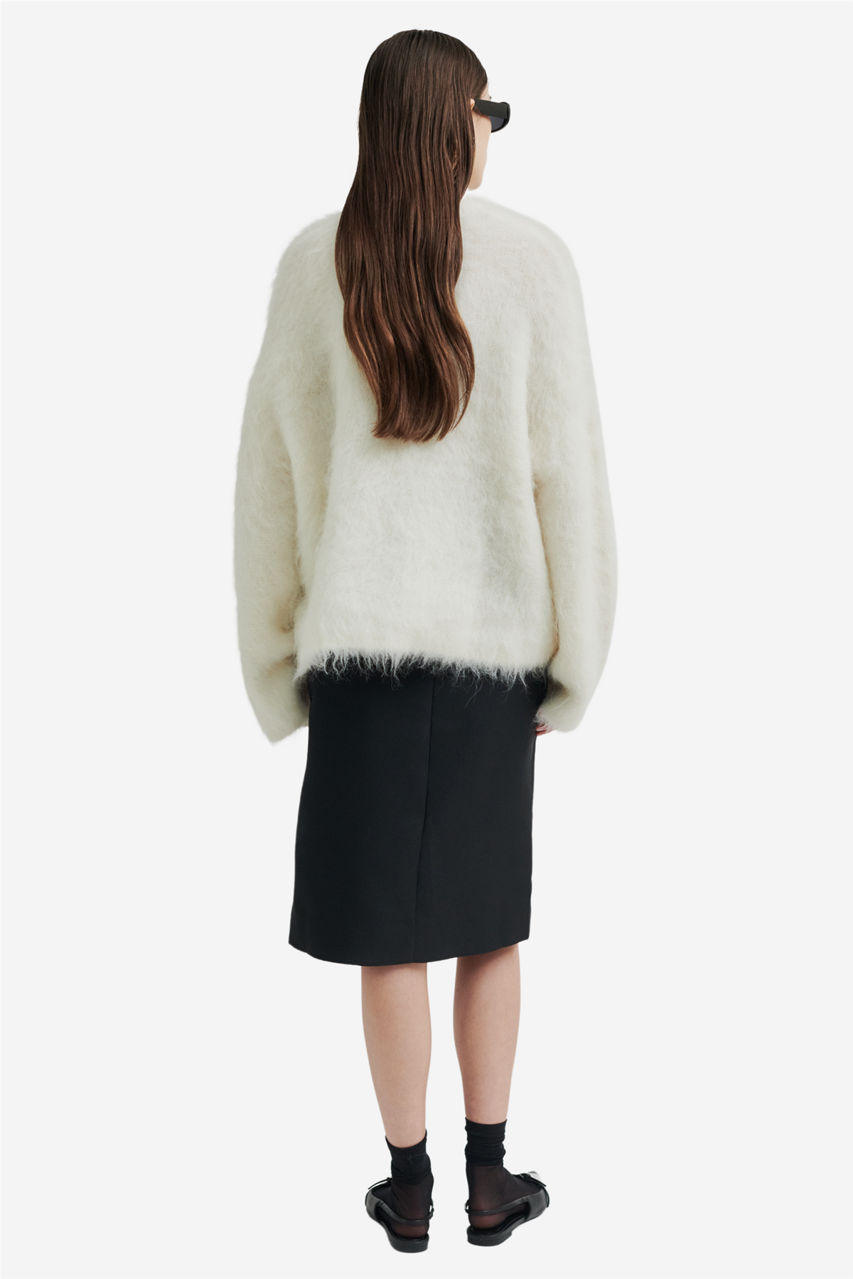 Isaky Knit T-Neck fra Second Female. Denne genseren er laget i en tykk, myk og stretchy alpakka-blanding med en lett fluffy tekstur. Genseren har høy hals og lave skuldersømmer med vide ermer. Ribbestrikkede kanter på hals, mansjetter og nederkant. Oversized og avslappet passform.