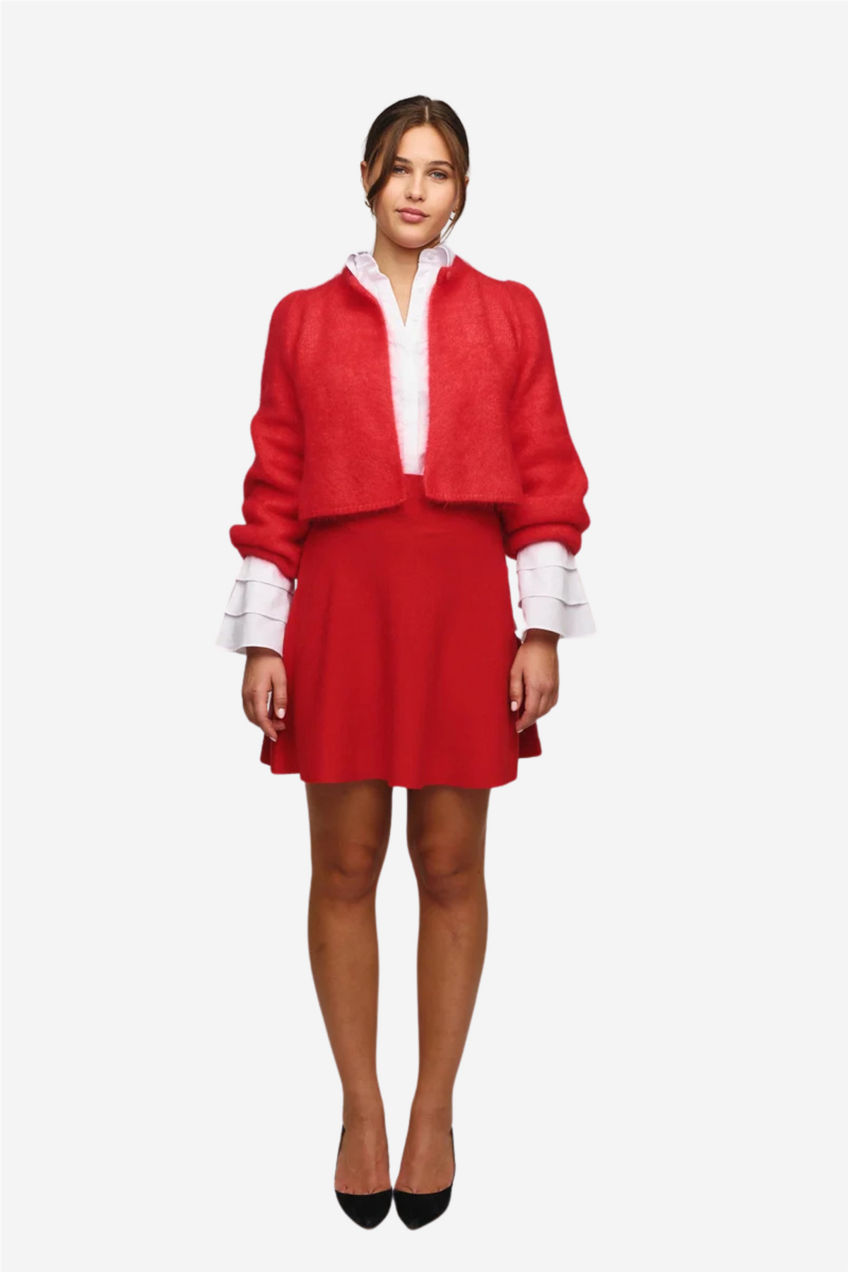 Amelia er en tykk, A-formet cardigan med en cropped passform. Den har lange ermer med knappelukking foran og tettsittende mansjetter. Den perfekte cardiganen for flere anledninger!