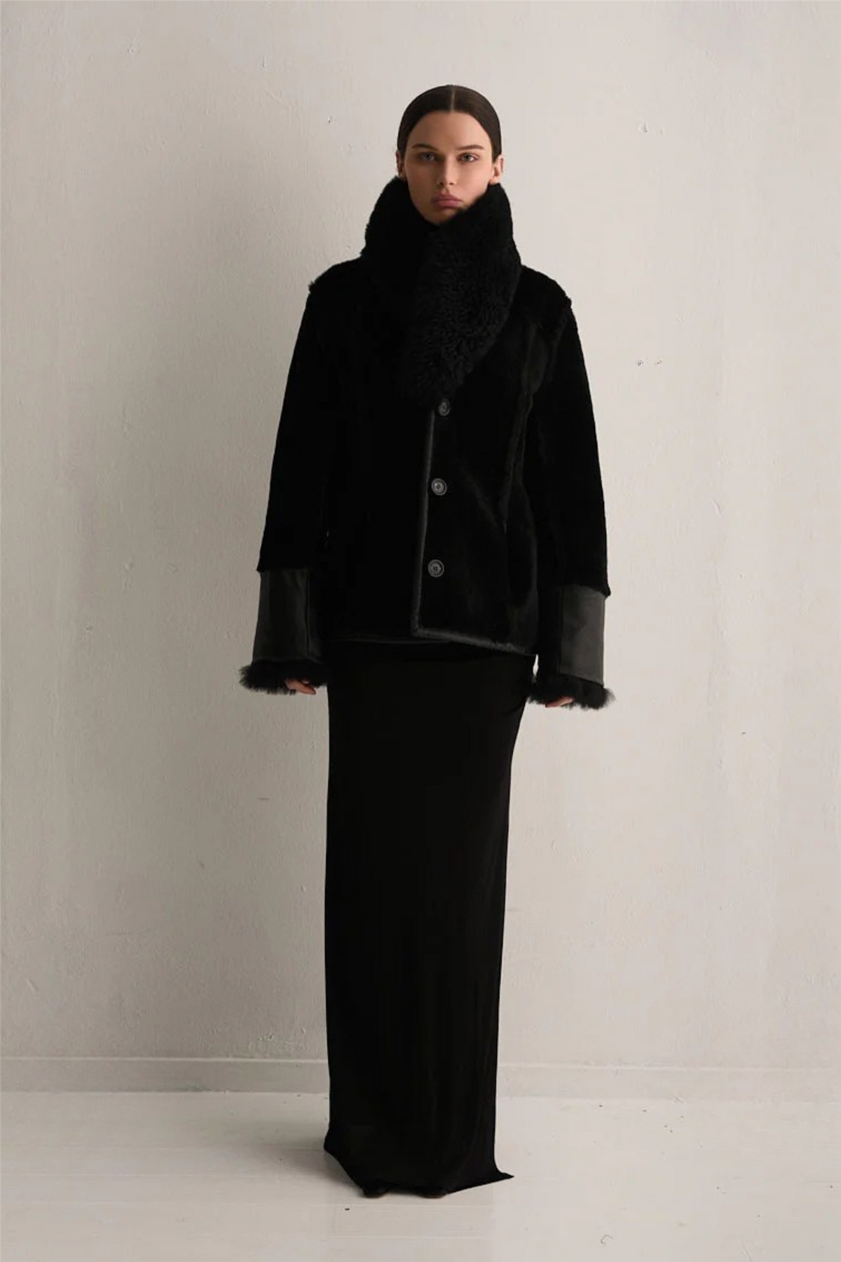 Woodstock Jacket Short fra Envelope1976 er en eksklusiv lammeskinnsjakke med mykt saueskinn på innsiden, designet med et fullt reversibelt uttrykk. Det gjør at du sømløst kan veksle mellom glatt skinn og luksuriøst shearling for ulike anledninger og stiler. Jakken har et kort, moderne snitt, rette ermer, to lommer og knappelukking for et rent og sofistikert uttrykk. Et allsidig statement-plagg som kombinerer varme, fleksibilitet og moderne eleganse.