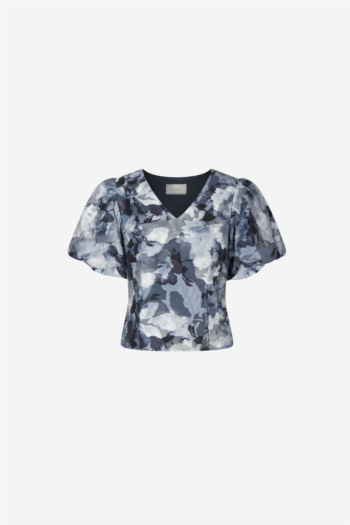 Camia Brocade Floral Blouse fra Neo Noir. Tettsittende bluse med puffede statement-skuldrer og V-hals. Brokade-stoffet har en organisk strukturert overflate som skiller seg ut, perfekt for fester. Modellen er 176 cm høy og har på seg størrelse 36.