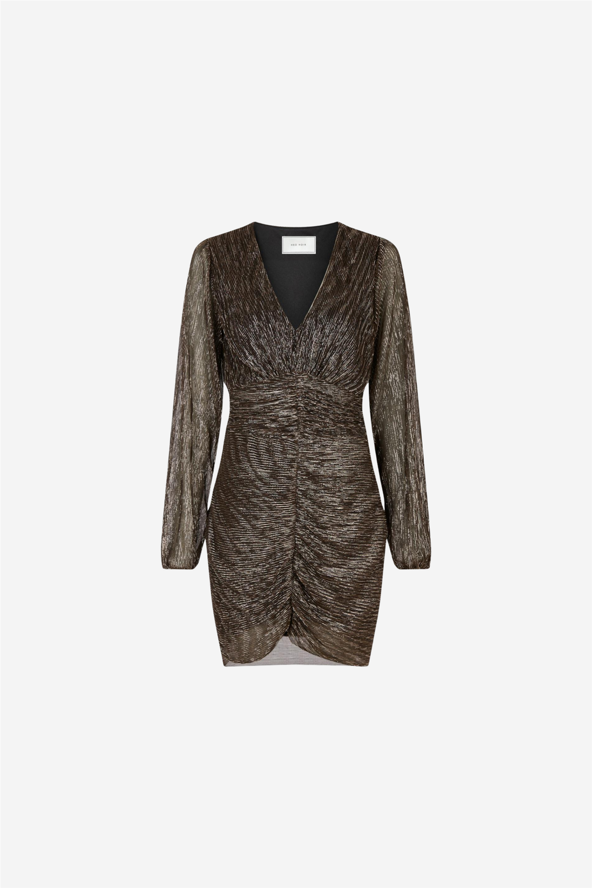 Neo Noir Wallis Glitz Dress er en nydelig minikjole med puffermer, trangt skjørt og rysjer nedover hele. Kvaliteten har glitter og fint print. Modellen er 176 cm og har på størrelse 36.
