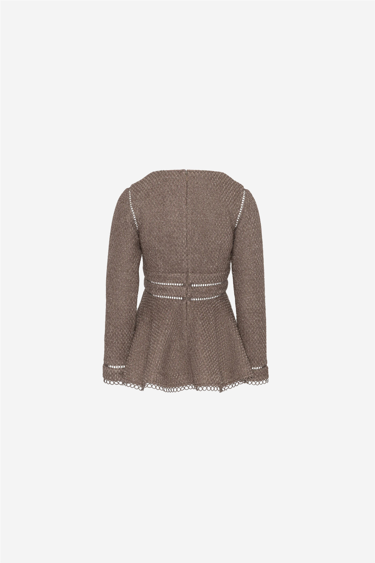 Ellie Top fra Love Lolina er en elegant og tidløs bluse designet i et teksturert taupe-stoff med et subtilt metallisk skinn. Den har en flatterende V-hals, lange ermer og delikate detaljer i midje som gir et feminint uttrykk. Den skjulte glidelåsen i ryggen sørger for en sømløs silhuett og komfortabel passform.