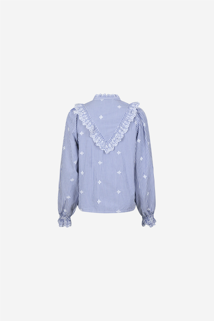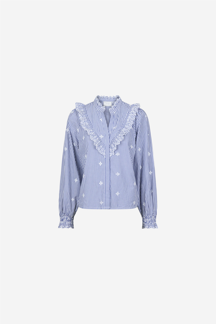 Degas Stripe Blouse fra Neo Noir. Pen skjorte med volangdetaljer på halsen, brystet og ermene.