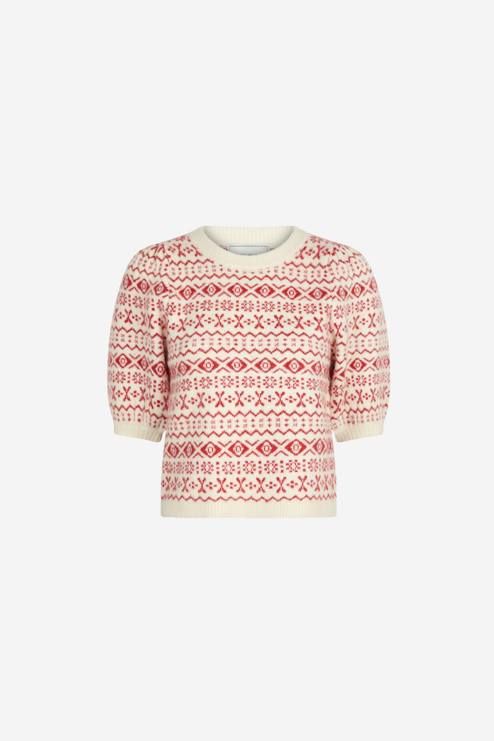 Abi Vintage Knit Blouse fra Neo Noir. Fin kortermet strikkegenser i vintage strikkemønster. Kvaliteten er myk. Modellen er 176 cm høy og bruker størrelse 36.