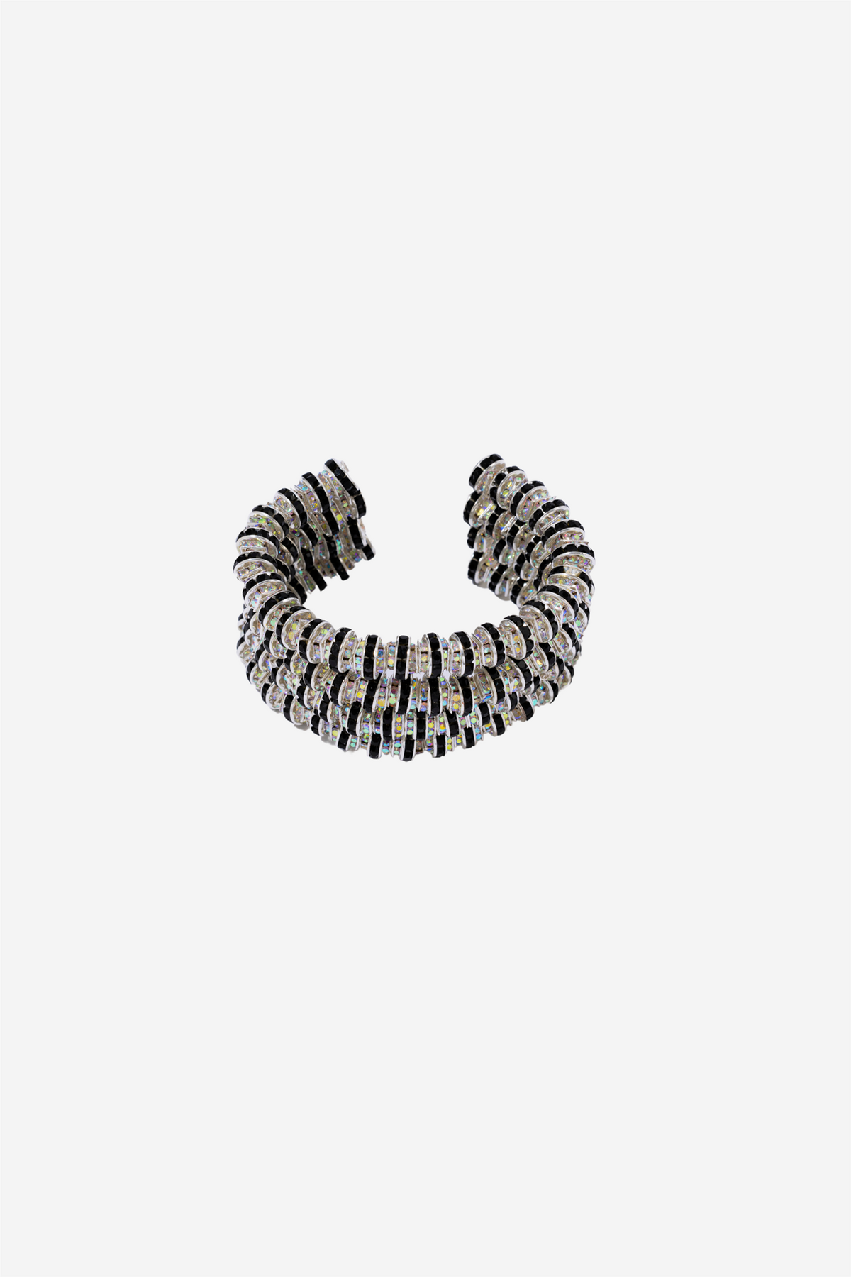 Cleopatra Bangle fra Pearl Octopuss.y er et chunky statement-armbånd laget av sølvbelagte Rondelle-perler. Perlende er tredd på en fleksibel wire for å gjøre det justerbart til ulike håndleddsstørrelser. Den åpne lukkinegn gjør armringen avslappet og allsidig