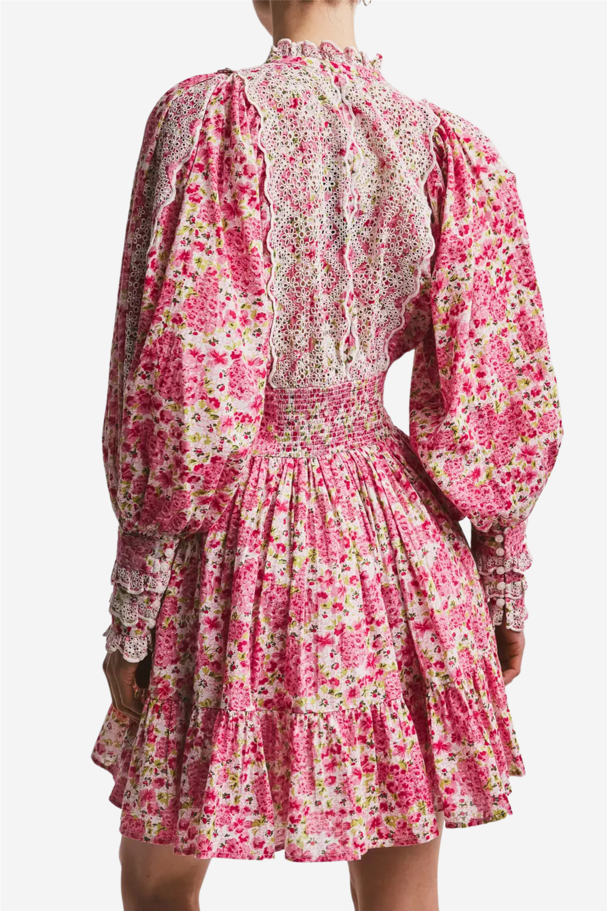 Cotton Slub Mini Dress fra By Timo. Cotton Slub Mini-kjolen er laget av lette og myke sertifiserte stoff, med slub-detaljer i tekstilen. Den har en mini-lengde, en ettersittende midje med smock i ryggen og et voluminøst A-formet skjørt. Kjolen har oversized, vintage-inspirerte ermer og broderie anglaise-innlegg på brystet, ermene, mansjettene og halsen. Overdelen har knapper foran, og skjørtet har en volangdetalj langs falden.
