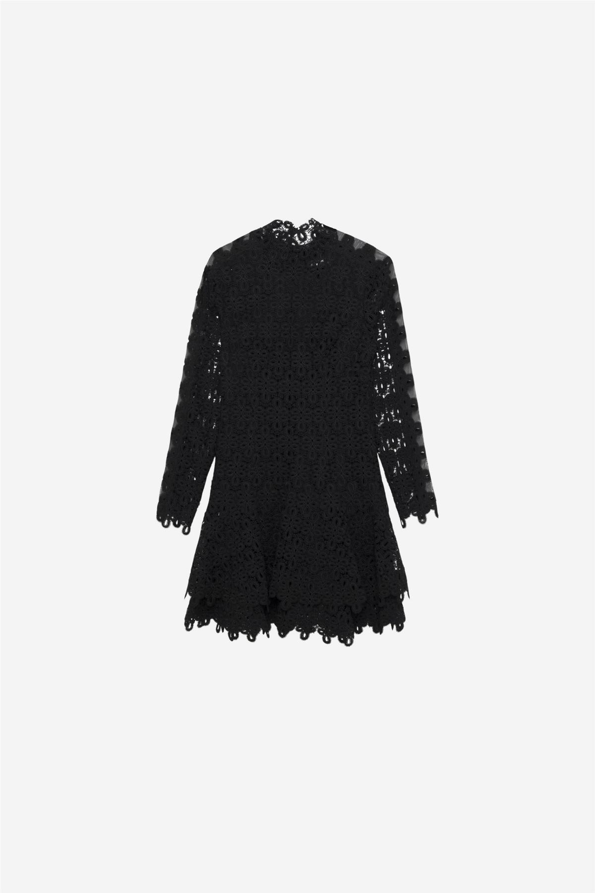 Joy Guipure Lace Mini Dress fra Simkhai. Simkhai sin signatur minikjole i guipure-blonde i svart. Denne figurnære A-linjekjolen er laget av vår karakteristiske guipure-blonde og har en leken, kort blondelag-på-lag-kant, transparente lange ermer og en avrundet høy hals. En ekte SIMKHAI-signatur.