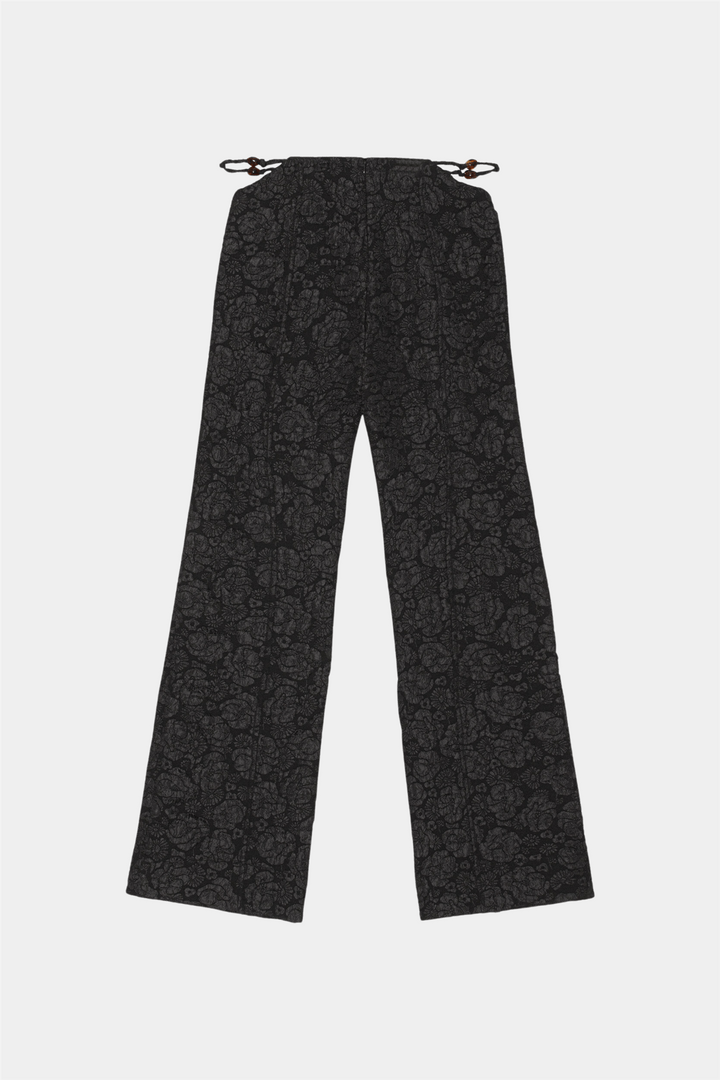 Stretch Jacquard Flared Pants fra Ganni er et par dressbukser laget av en blanding av resirkulert polyester. Buksene er designet for en slank passform i midjen og over hoftene, med sleng fra knærne, og har utskjæringsdetaljer med perler på hoften. Utsvingte ben og glidelåslukking bak.