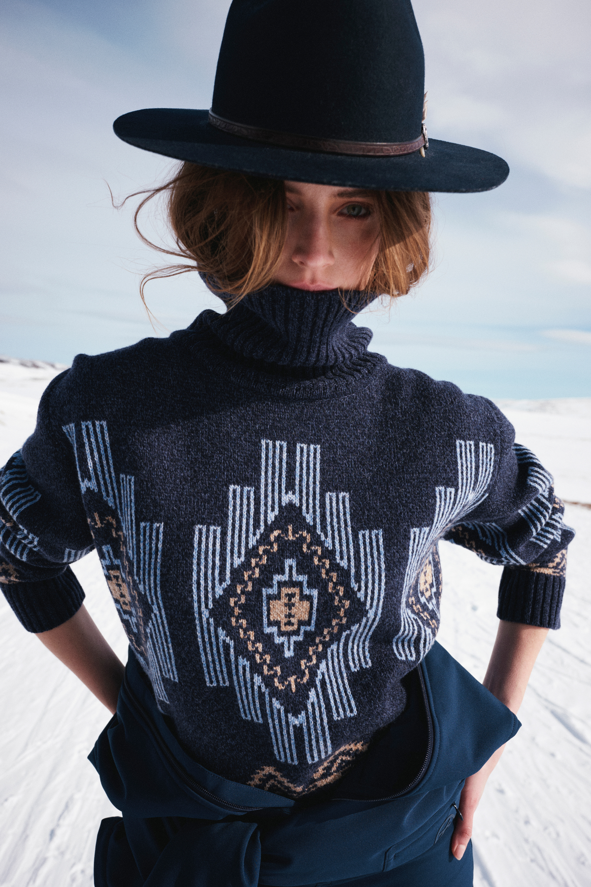 Kautokeino Sweater fra We Norwegian er strikket i en myk, kløfri ullblanding og har et iøynefallende jacquardmønster som komplementerer de andre plaggene i Kautokeino-serien. Bruk den alene som en varm og stilsikker après-ski-genser, eller kombiner med den matchende ponchoen eller vesten for et helhetlig og uttrykksfullt antrekk.
