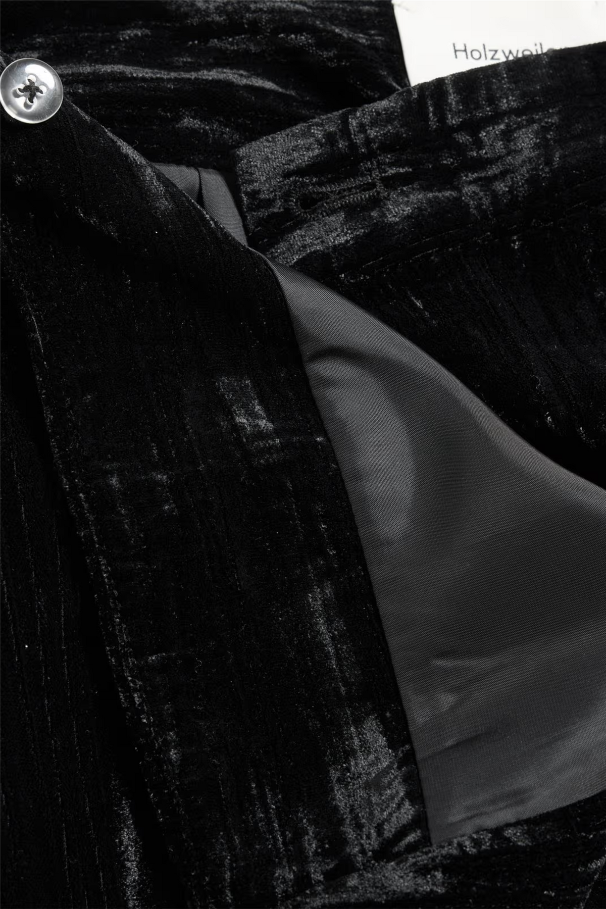 Cygnet Velvet Skirt from HolzweilerThe Cygnet Velvet skirt sits high at the waist and has a wrap style with a button closure at the front. Style it with the matching Cygnet Velvet blazer.