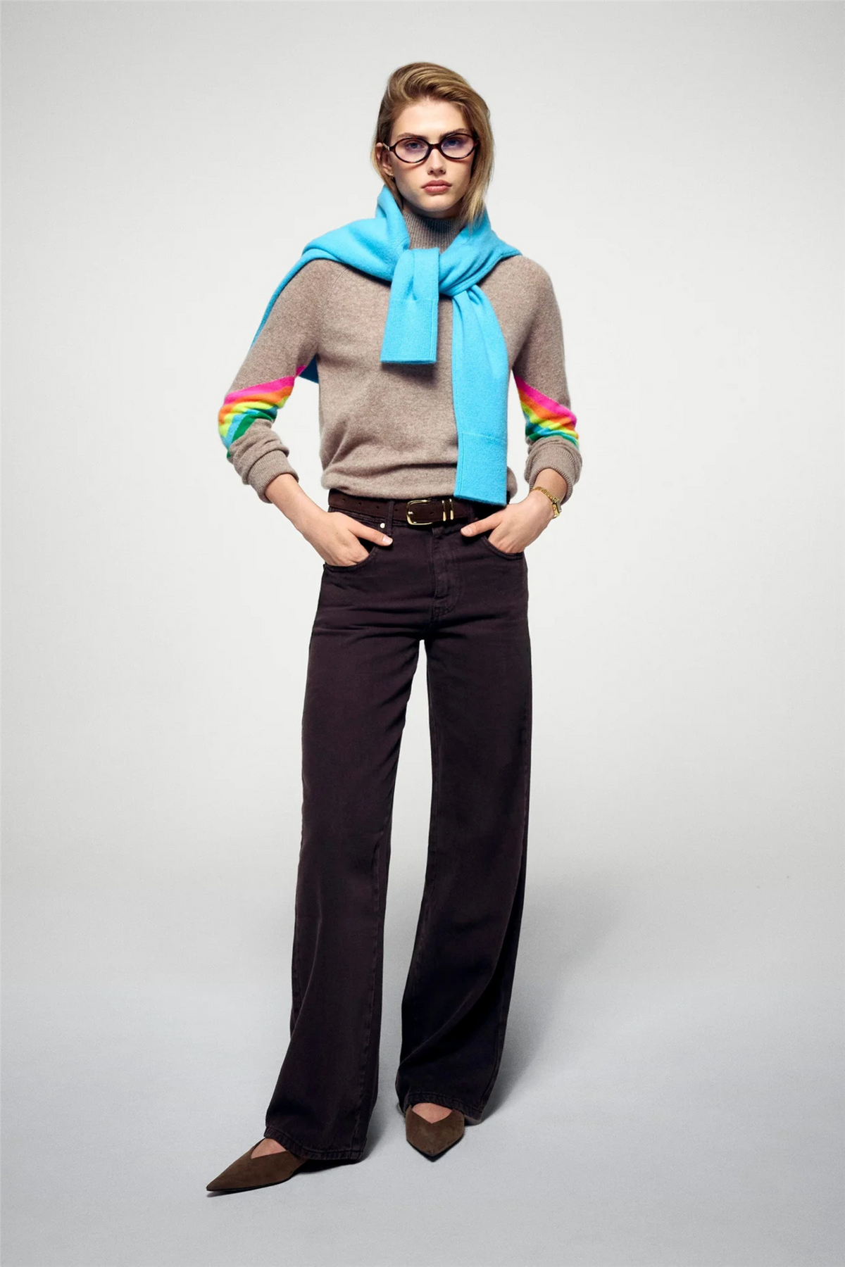 Mock Neck Sweater fra From Future. Denne lette, kortere cashmere-genseren har høy hals og ribbede kanter, med flerfargede striper langs ermene som gir en frisk kontrast og løfter ethvert antrekk.