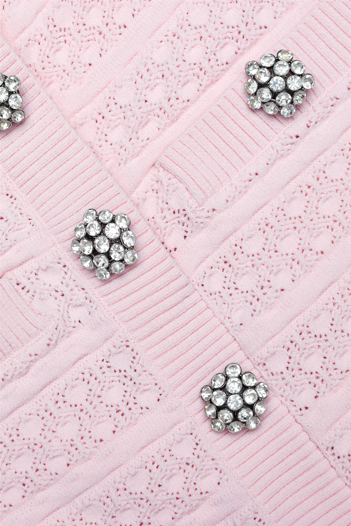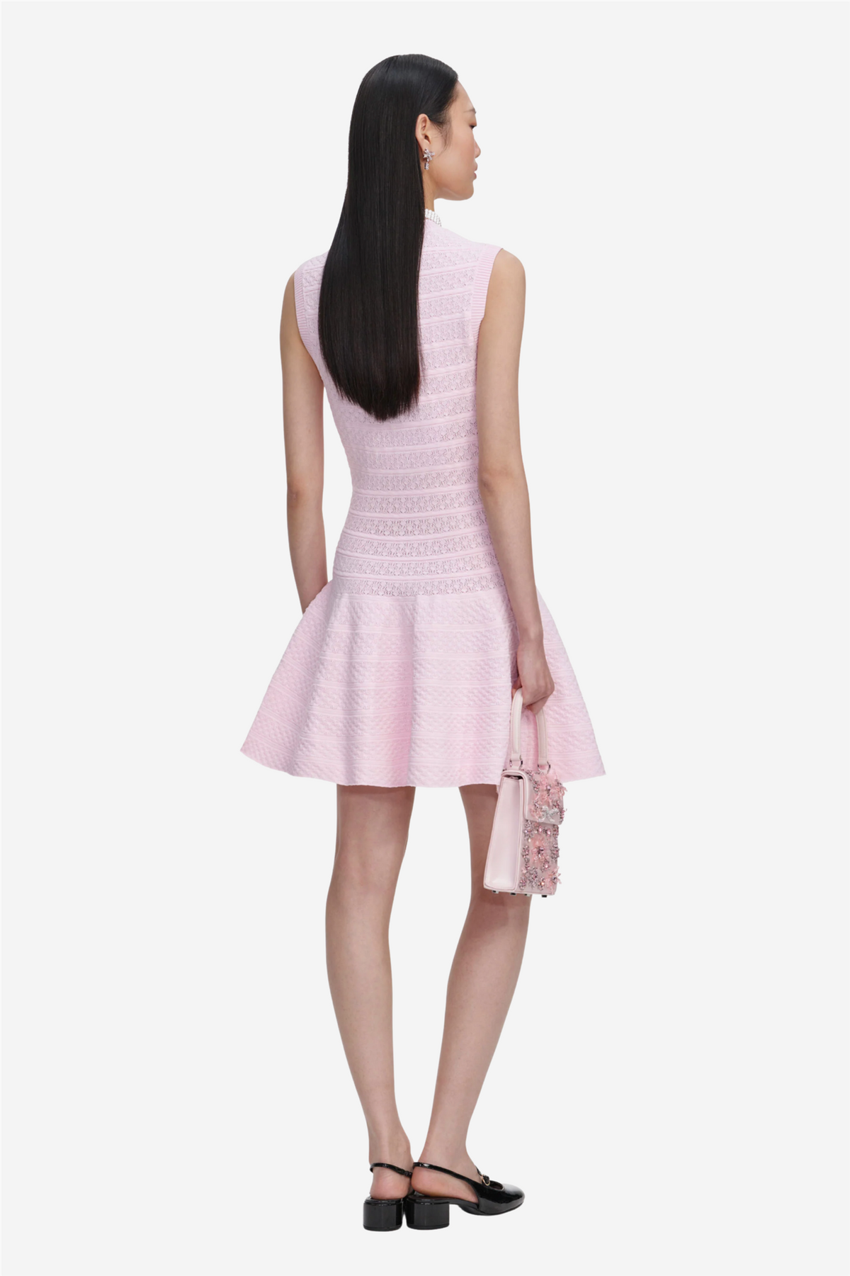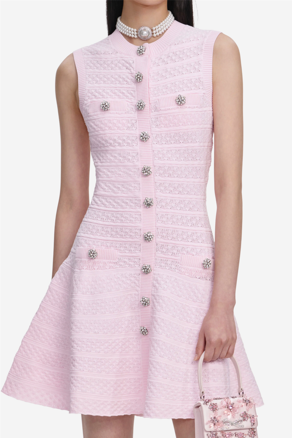 Pointelle Diamante Knit Mini Dress fra Self-Portrait. Denne rosa pointelle-strikkede minikjolen skiller seg ut med en senket midje og et skaterinspirert skjørt som gir silhuetten både struktur og bevegelse. Diskrete diamanté-detaljer fungerer som prikken over i-en og tilfører et subtilt glimt av glamour. Like elegant stylet med flate sko som løftet med hæler, en moderne allrounder med edge.