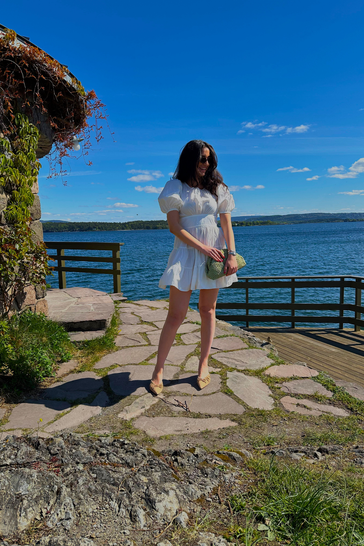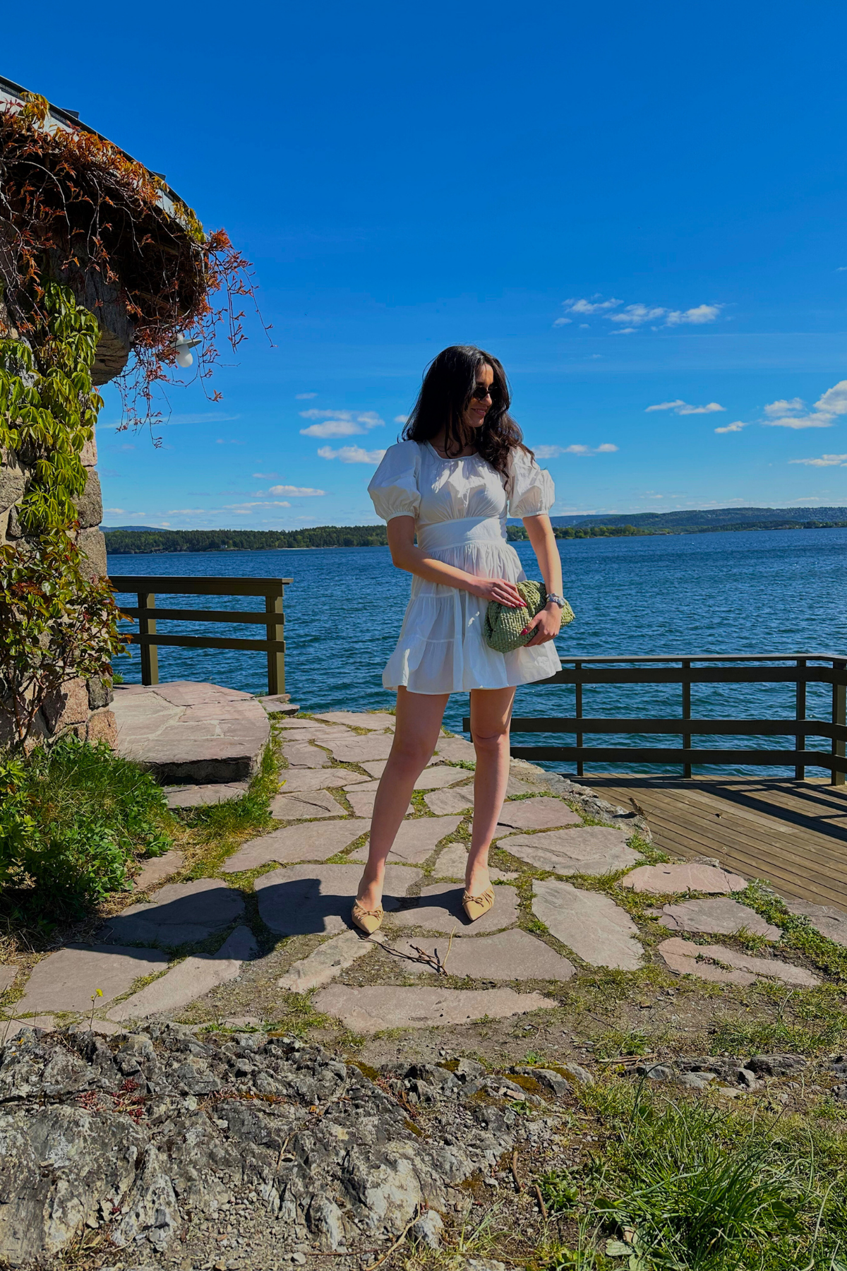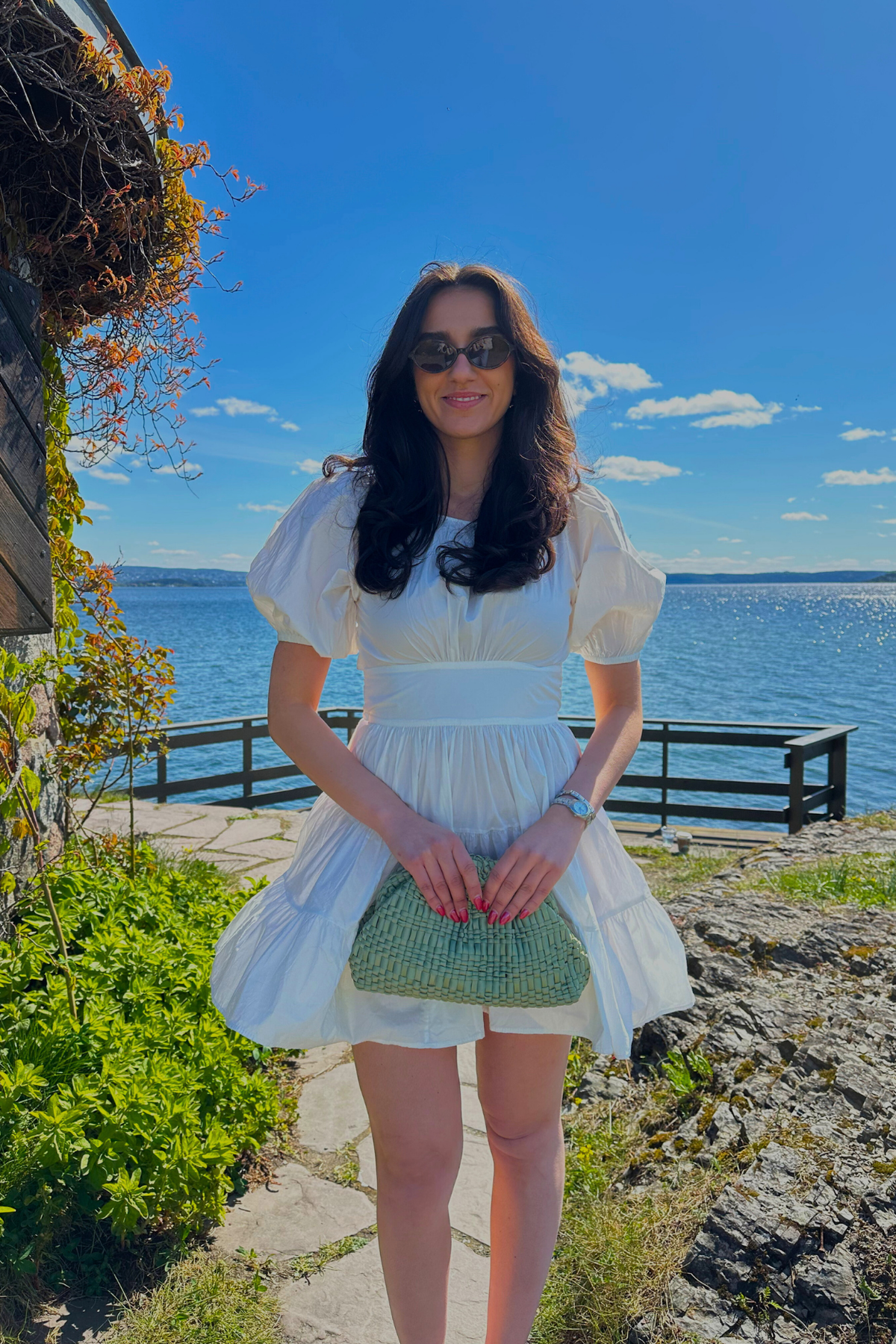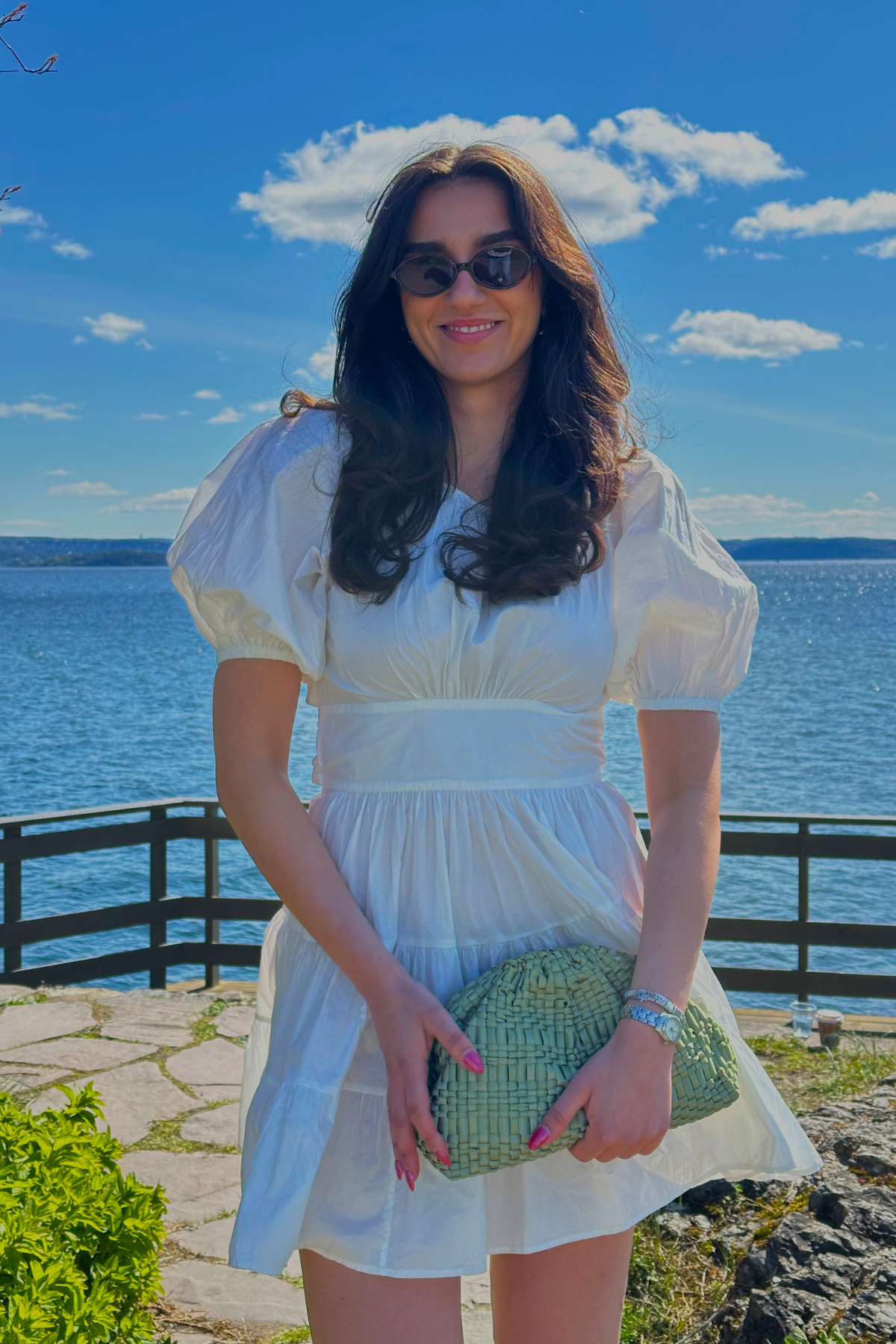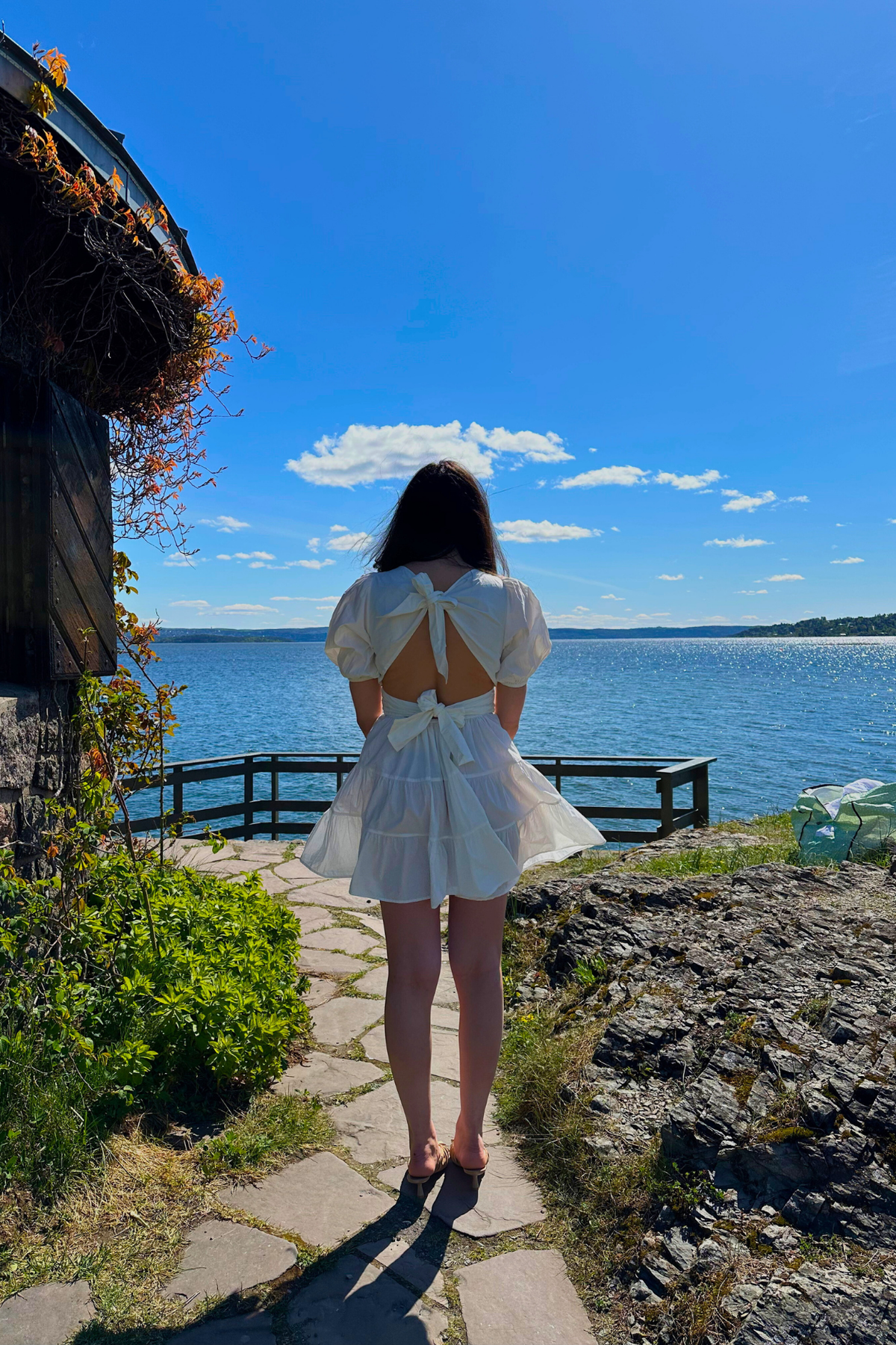 Poplin Mini Dress from byTiMo is a mini dress with a fitted waistline, round collar, A-shaped skirt and short puffed sleeves with eastisIt is made from their soft GOTS certified cotton and can be tied with a bow at the back. The deep gathers on the skirt create a lot of movement and volume.