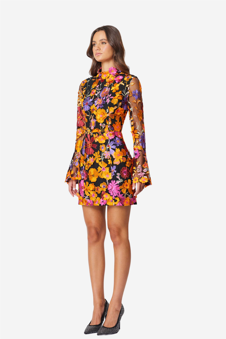 Alessandra Longsleeve Mini Dress from Elliatt. With long sleeves and elegantly designed flared cuffs, this mini dress offers a perfect blend of sophisticated style and modern trends. The high collar, embellished with intricate 3D floral motifs, adds a feminine touch and draws attention to the delicately crafted details.