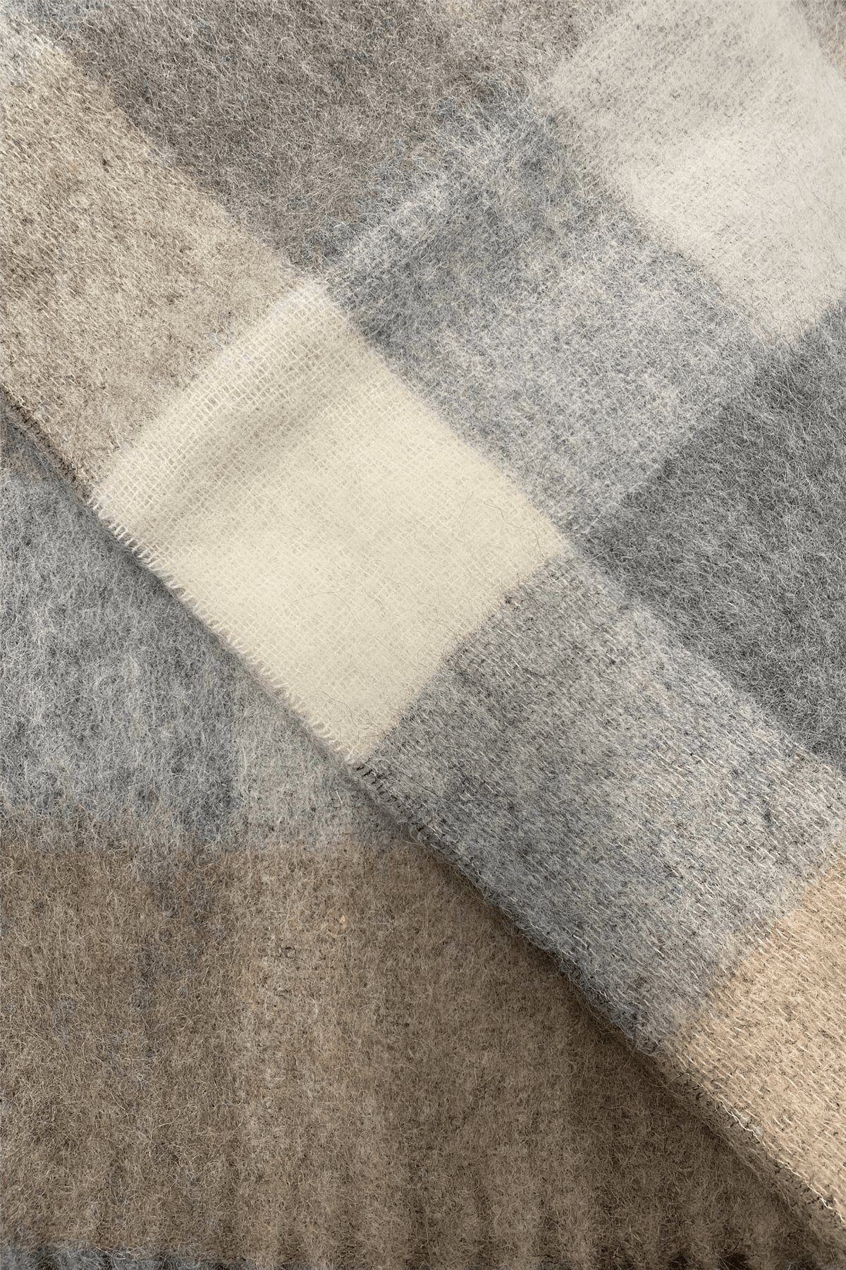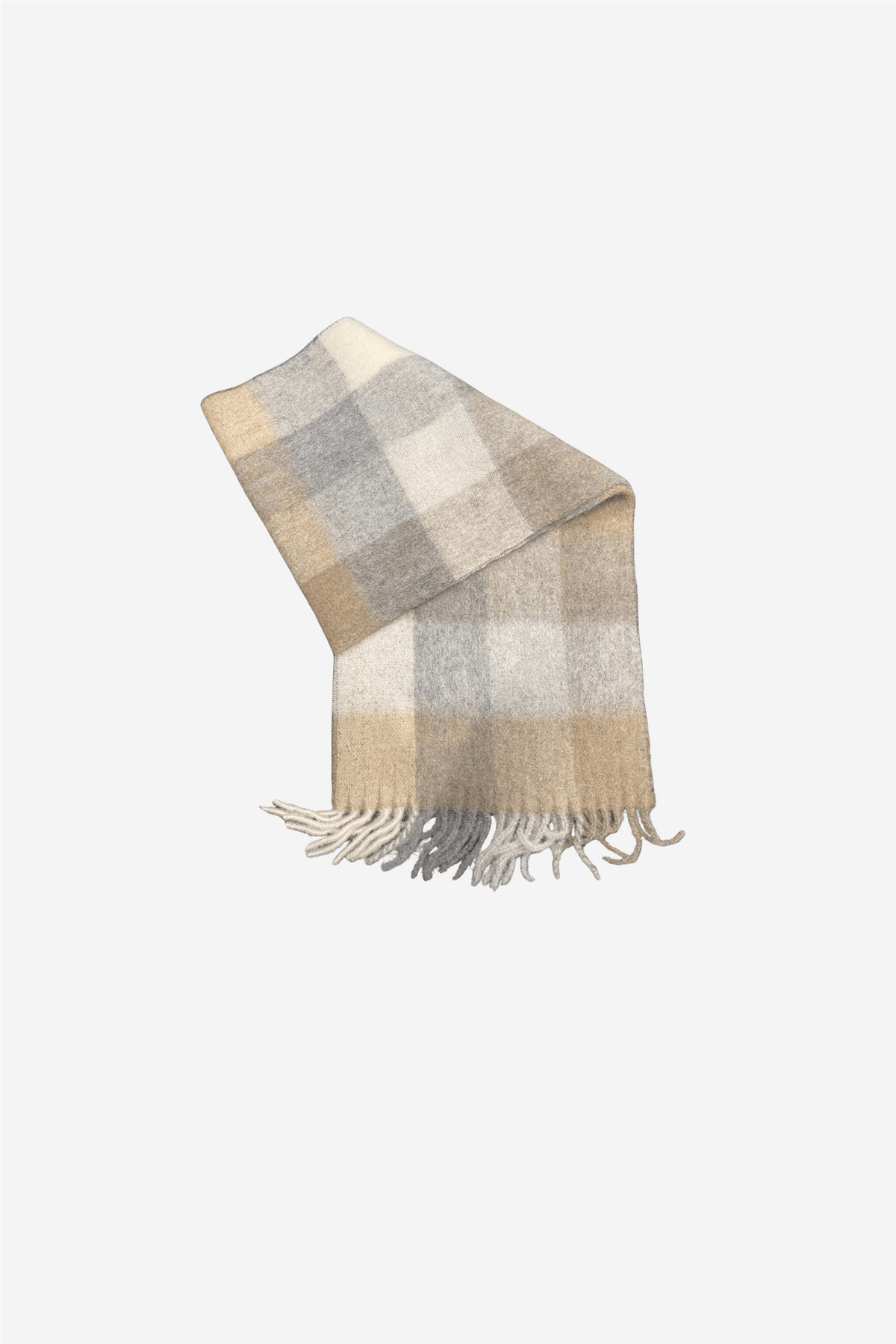 Holzweiler Fresia S-skjerf er laget i en myk bouclé-blanding med alpakka. Det har et rutete mønster og frynsete kanter.