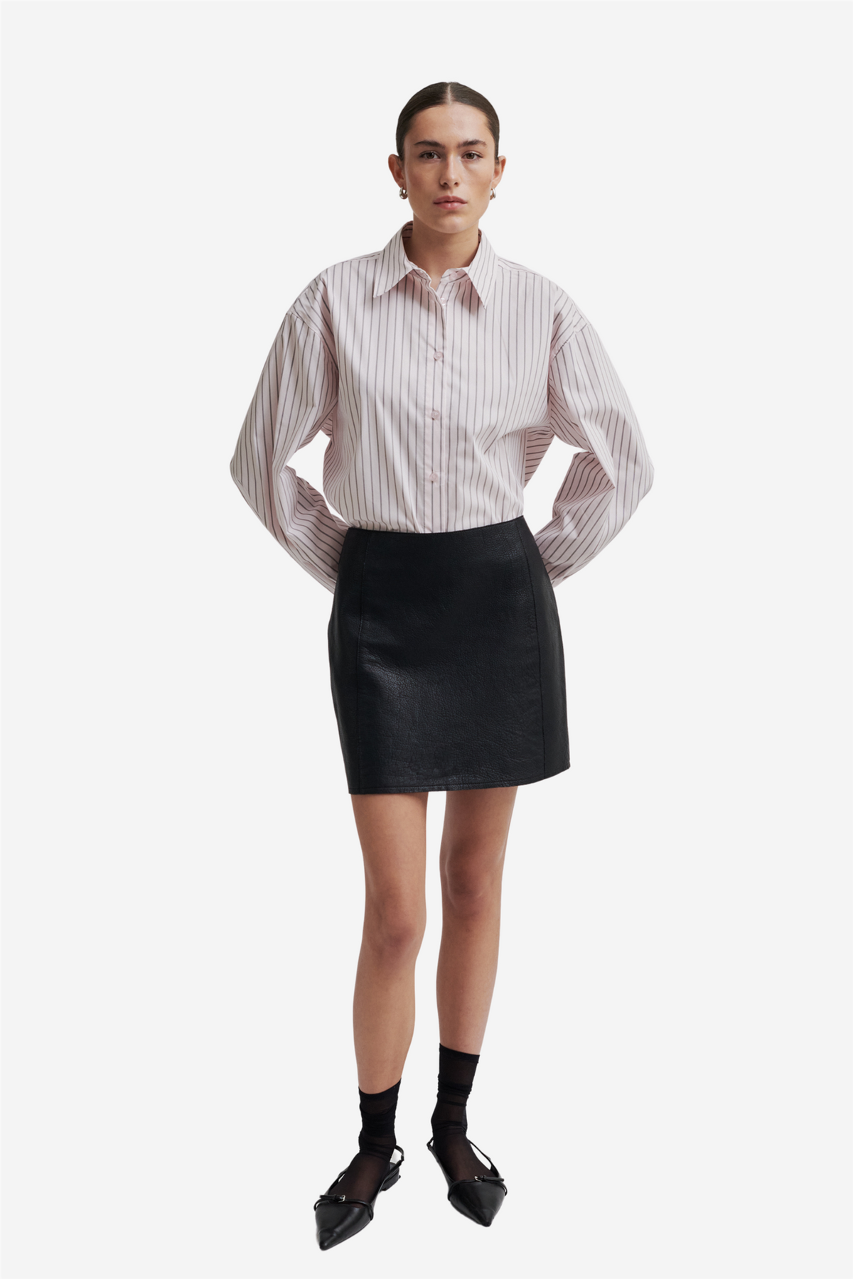 Orleans Leather Skirt from Second Female is made of thick, structured leather. The skirt has a hidden zipper closure at the back and vertical seams at the front and back. Mini length, short and figure-hugging silhouette.