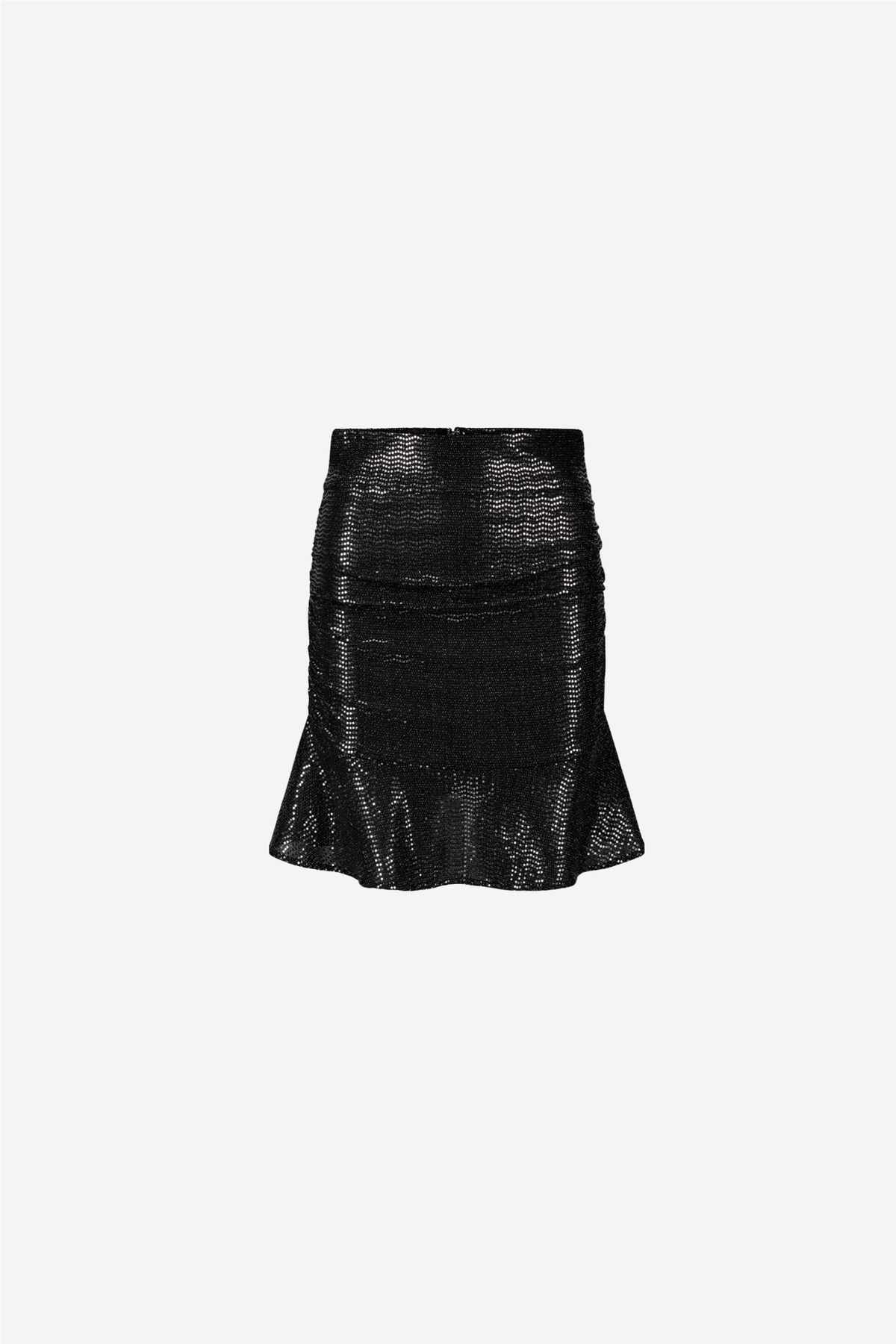 Ginger Ginger silver skirt from Ella&il. The Ginger silver skirt is an elegant and playful short skirt with a figure-hugging fit around the hips that creates a flattering silhouette. The skirt has a ruffled hem that adds a touch of style and movement. Gathering at the side seams and center back accentuates the fitted style. A center back zipper and structured waistband provide a smooth and secure fit, making the skirt perfect for a night out or special occasions.