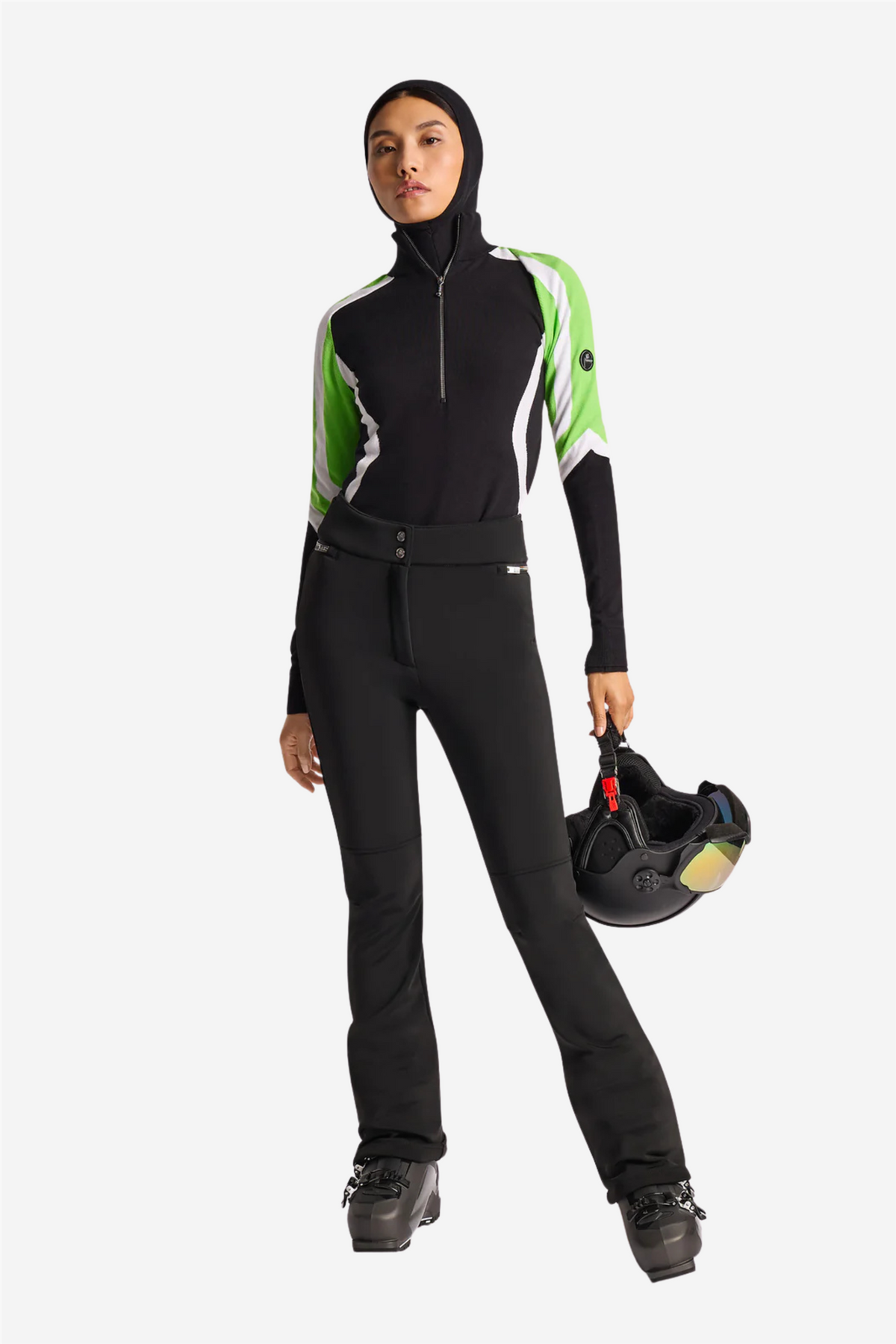 Elancia II Pants fra Fusalp. Elancia skibukse har en tydelig moderne, sporty-chic stil som fremhever silhuetten og gir et elegant uttrykk. Laget i stretchy, vindtett softshell med fleecefôr, gir den god varme og isolasjon. Et essensielt plagg i enhver kvinnes skigarderobe, kombiner den med en smalpasset skijakke for en ekstra glamorøs silhuett.