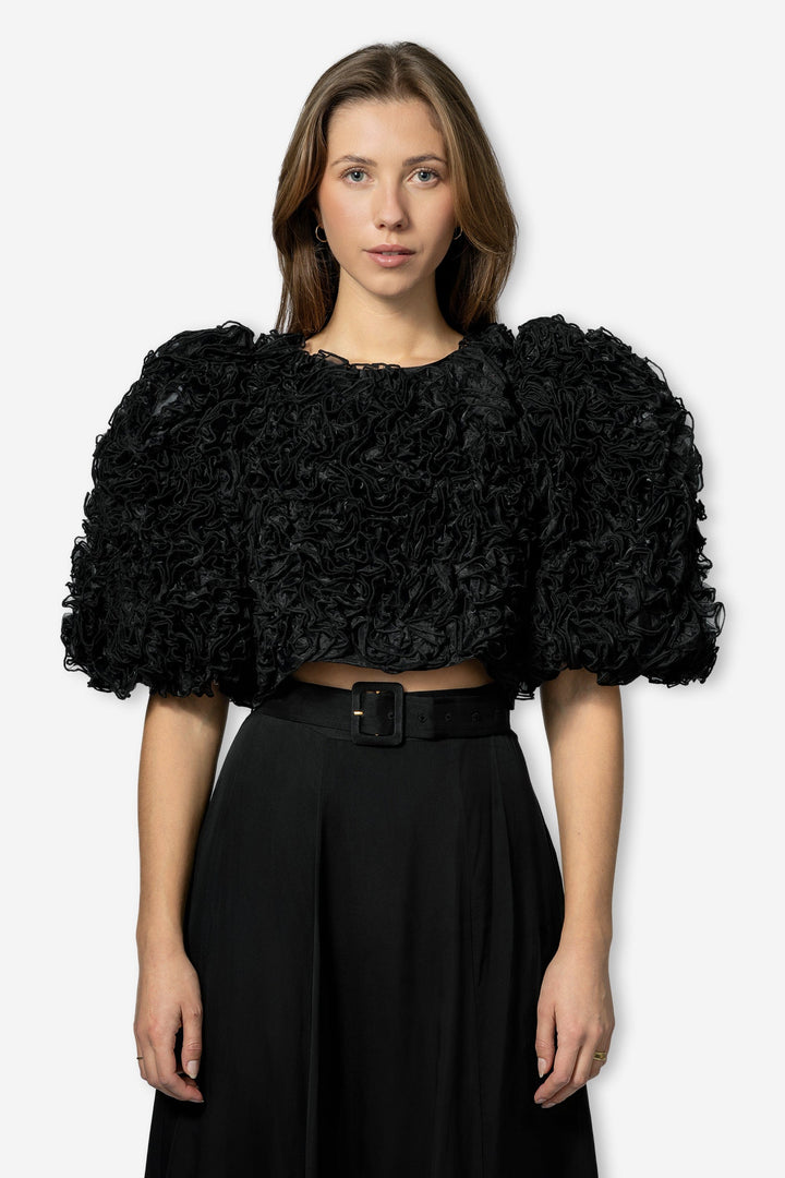 Organza Top from byTiMo is made in their elegant and slightly transparent certified viscose quality. The top has a slightly cropped fit and elbow-length sleeves with lots of volume. Round neck and buttons at the back. The front and sleeves are covered in ruffles.