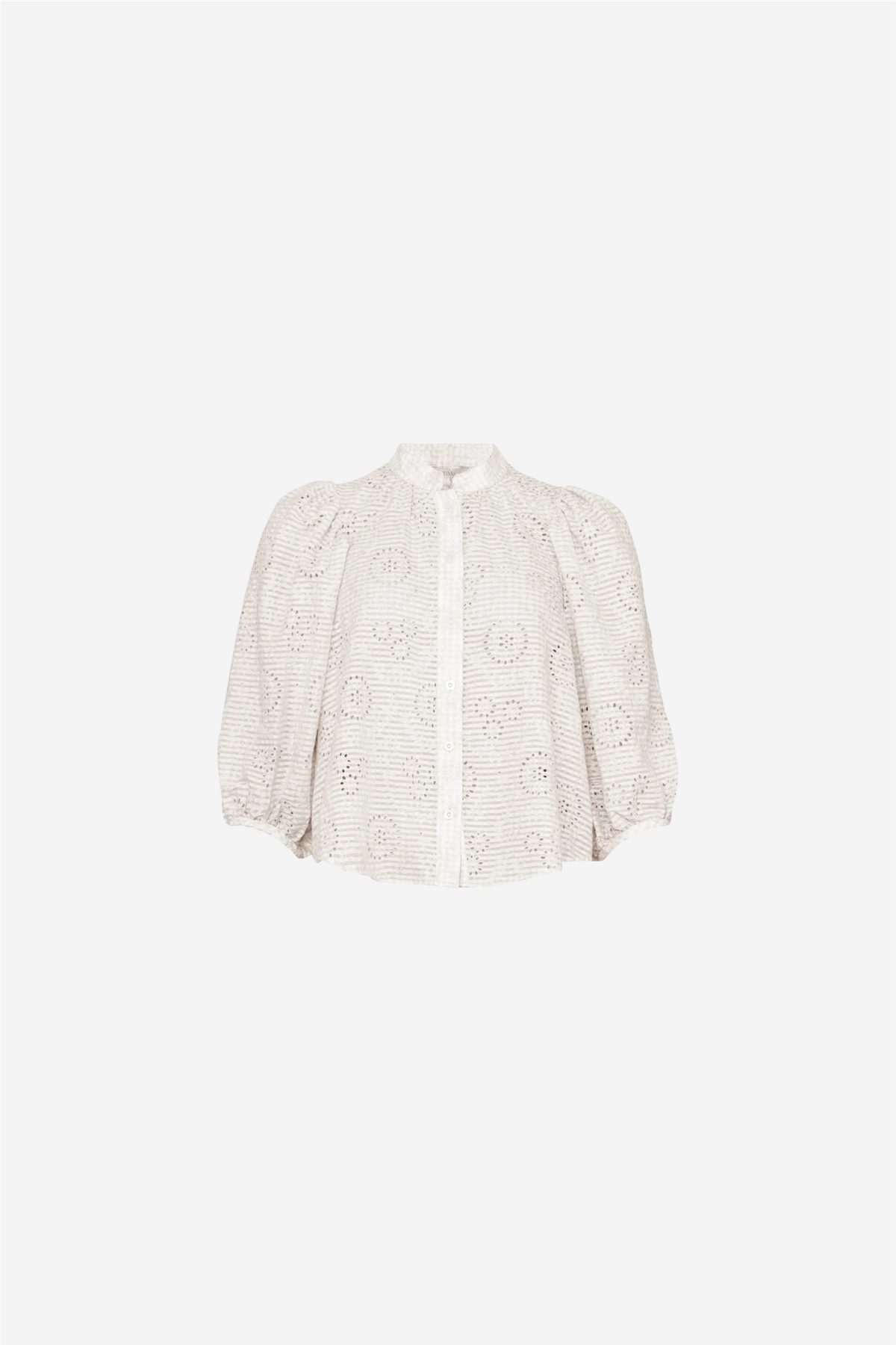 Checks Blouse fra ByTimo er laget i et mykt og lett GRS-sertifisert materiale med vakre broderidetaljer. Blusen har en avslappet silhuett, mandarin-krage og voluminøse trekvartlange ermer. Den lukkes med knapper hele veien ned foran.