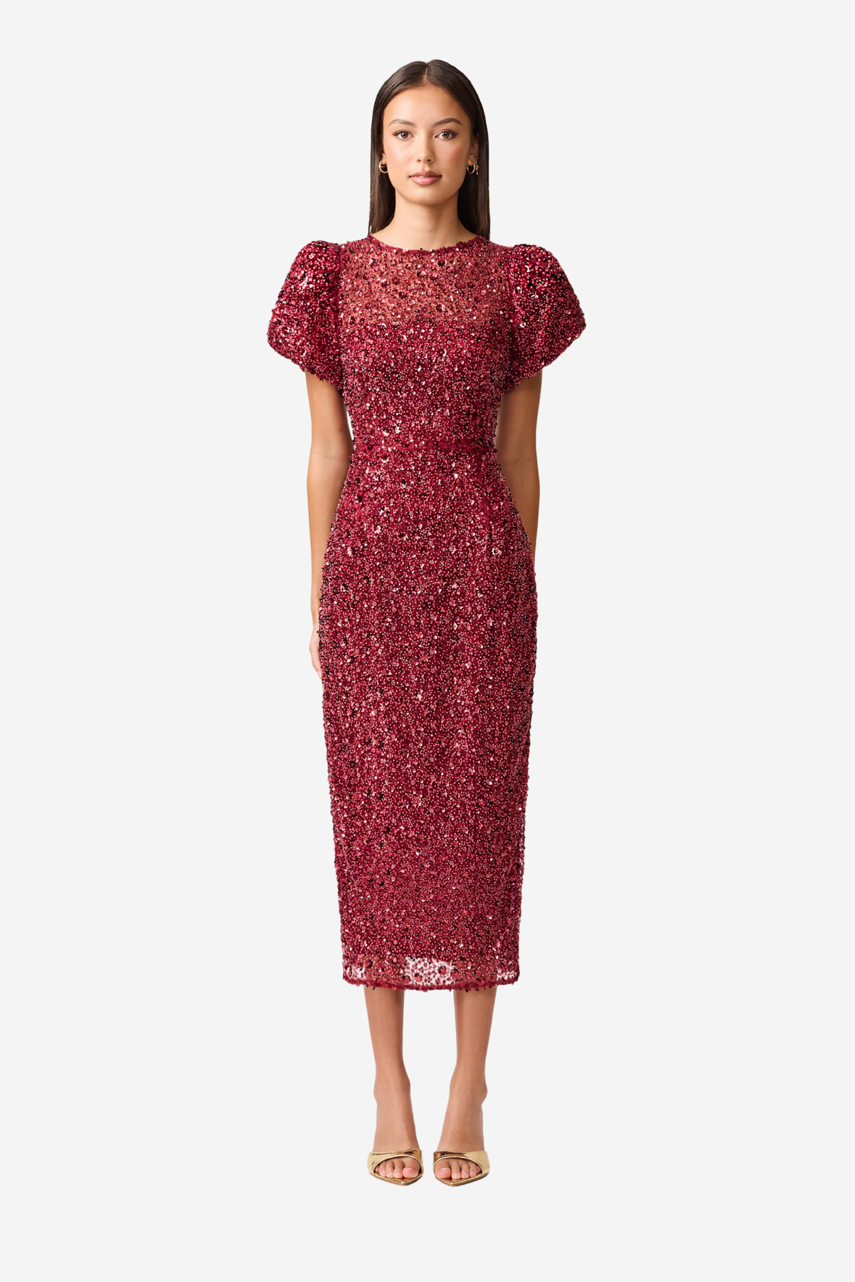Carmen Puff Sleeve Midi Dress fra Elliatt er en sofistikert midi-kjole med puffede ermer og et figurnært snitt som gir et elegant uttrykk med subtil dramatikk. Kjolen er laget i myk mesh dekorert med både perler og sequins, som tilfører glans, tekstur og luksuriøs detaljrikdom, samtidig som stoffet har litt stretch for komfort. Den strukturert overdelen balanseres av et lett utsvingt midi-skjørt, og kjolen har en usynlig glidelås bak for en sømløs finish. Fullt fôret for en jevn og raffinert silhuett, perfekt til formelle middager eller andre spesielle anledninger.