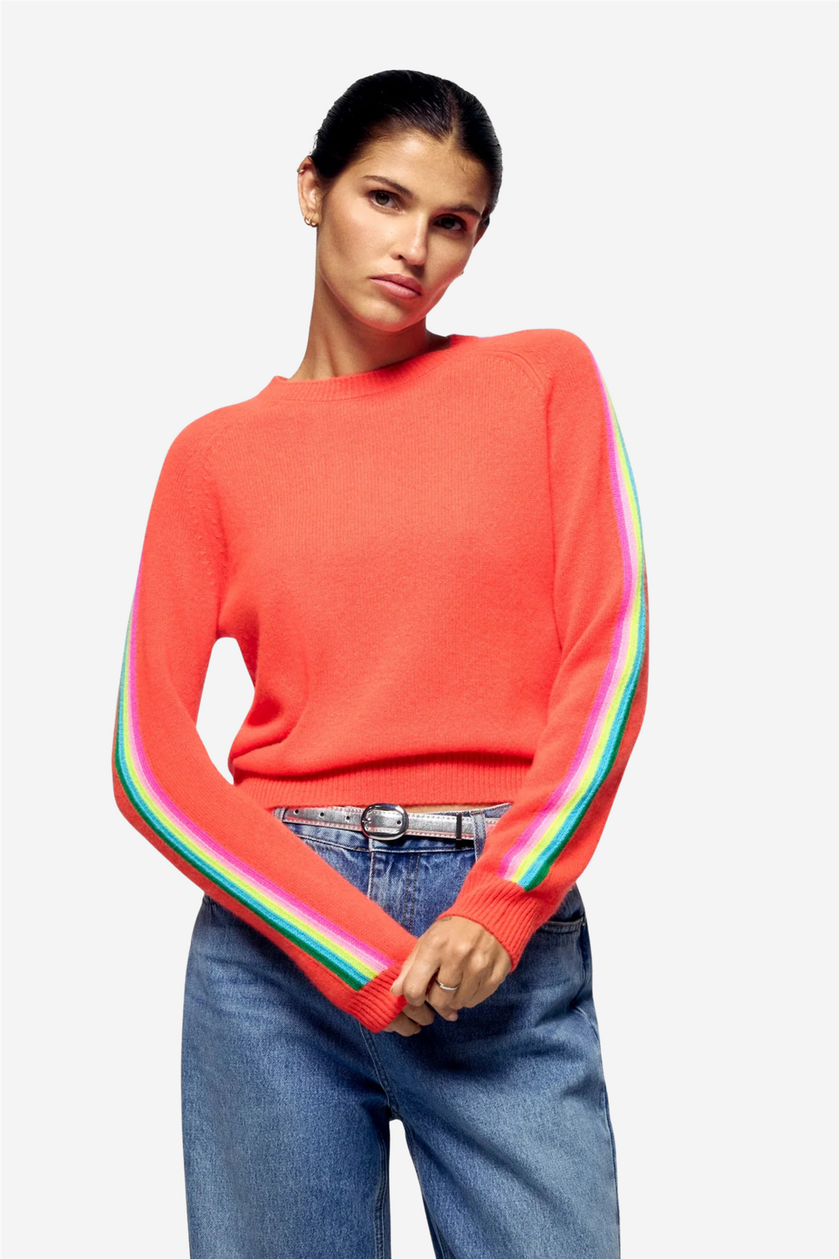 Crewneck Sweaters fra From Future. Denne kortere genseren i 100 % cashmere kombinerer tidløs luksus med en leken vri. De flerfargede stripene langs ermene gir et karakteristisk From Future-uttrykk. Sofistikert, men med et hint av attitude.