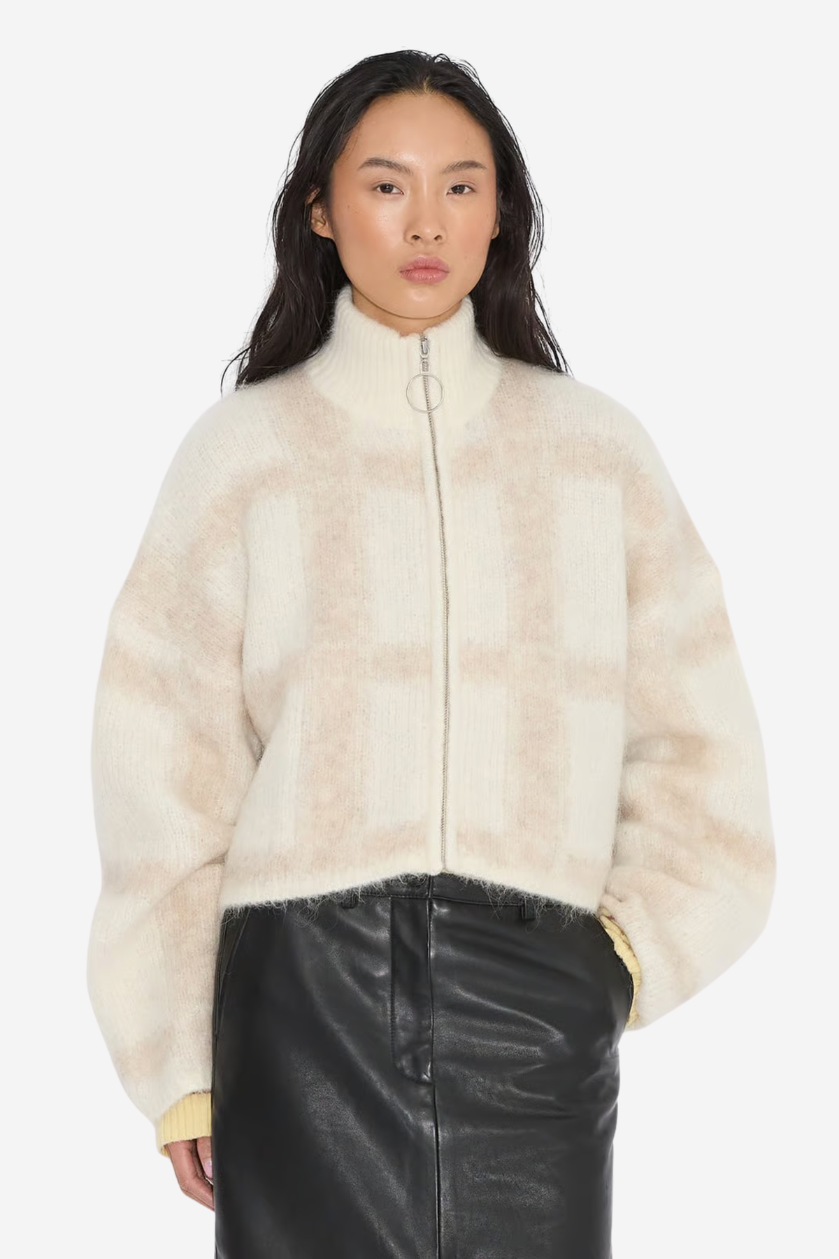Tine Light Check Cardigan fra Holzweiler er en kort cardigan i mykt, fluffy materiale med et diskret rutemønster. Den har avslappet passform, høy hals og glidelås i front, noe som gjør den enkel å style både åpen og lukket. Den lyse bruntonede fargemiksen gir et varmt og moderne uttrykk, perfekt for kjøligere dager. En allsidig cardigan som passer like godt til bukser som til skjørt, enten alene eller som et lag over en topp.