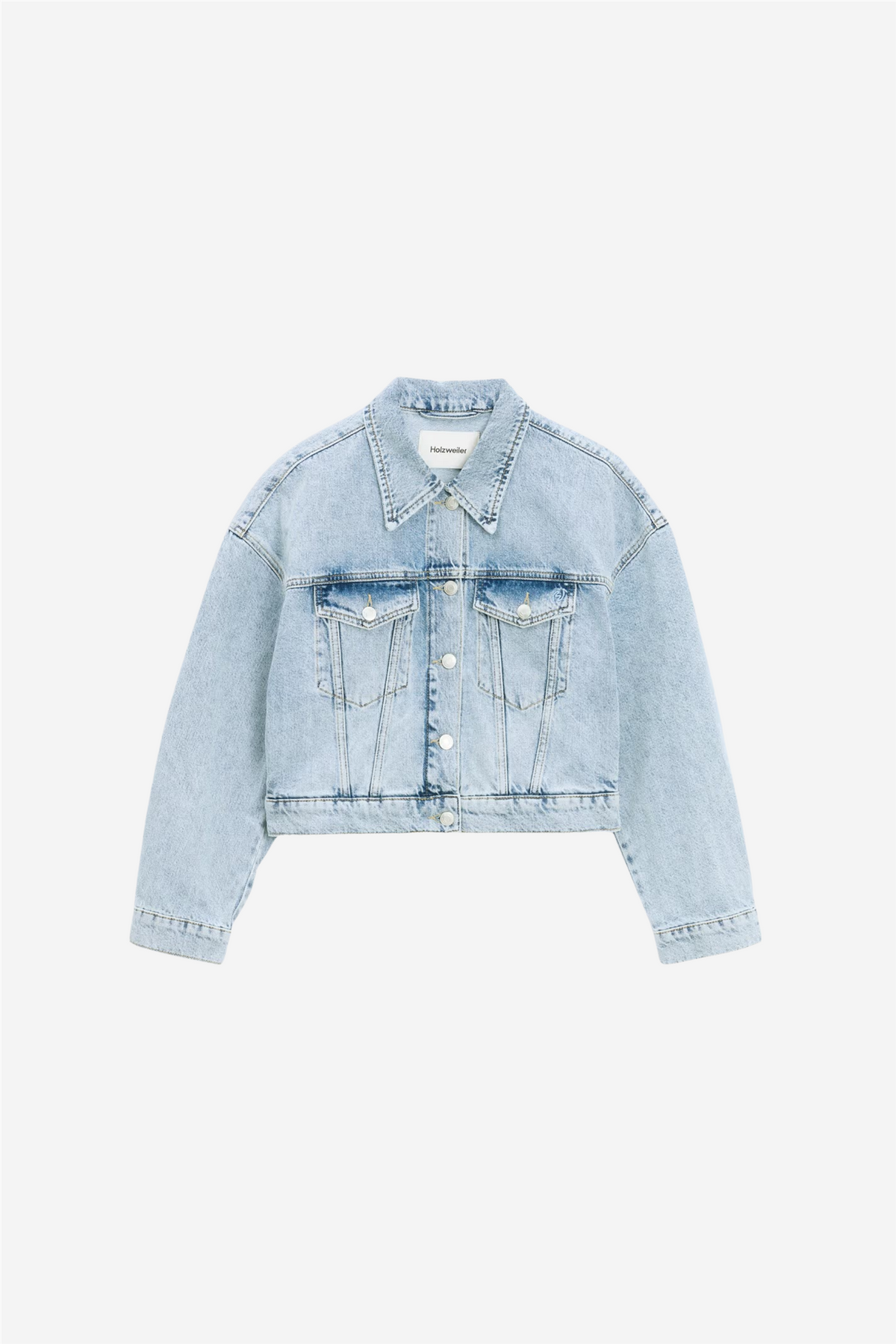 Designet kombinerer funksjon og signaturdetaljer: brystlommer med brodert H-logo, stikklommer i siden og klassiske metallknapper i front, på ermene og bak nederst. Bak finner du den ikoniske Holzweiler-patchen i skinn. Style den med jeans for en moderne tolkning av denimens helhetlige look.