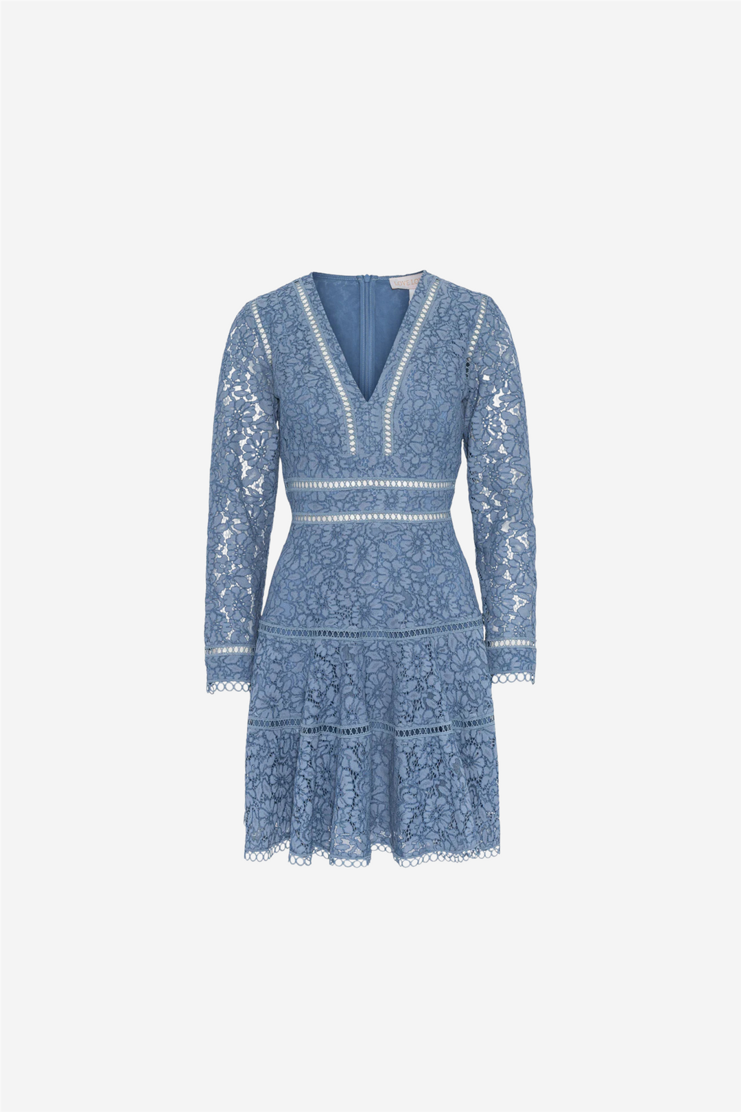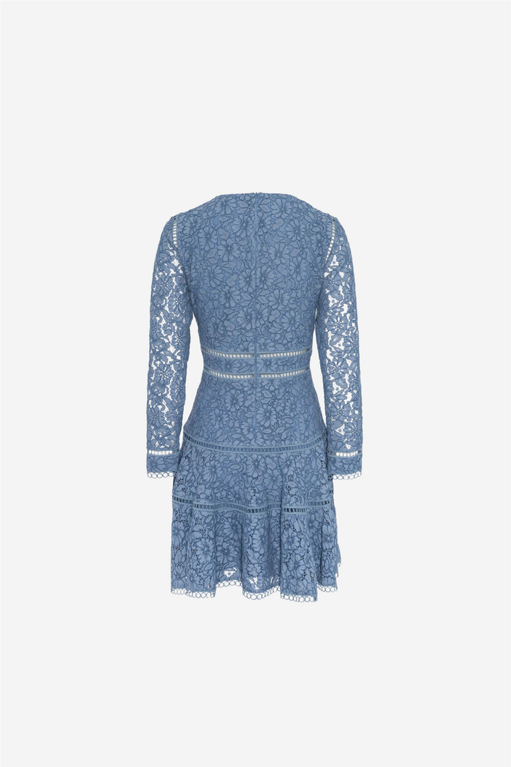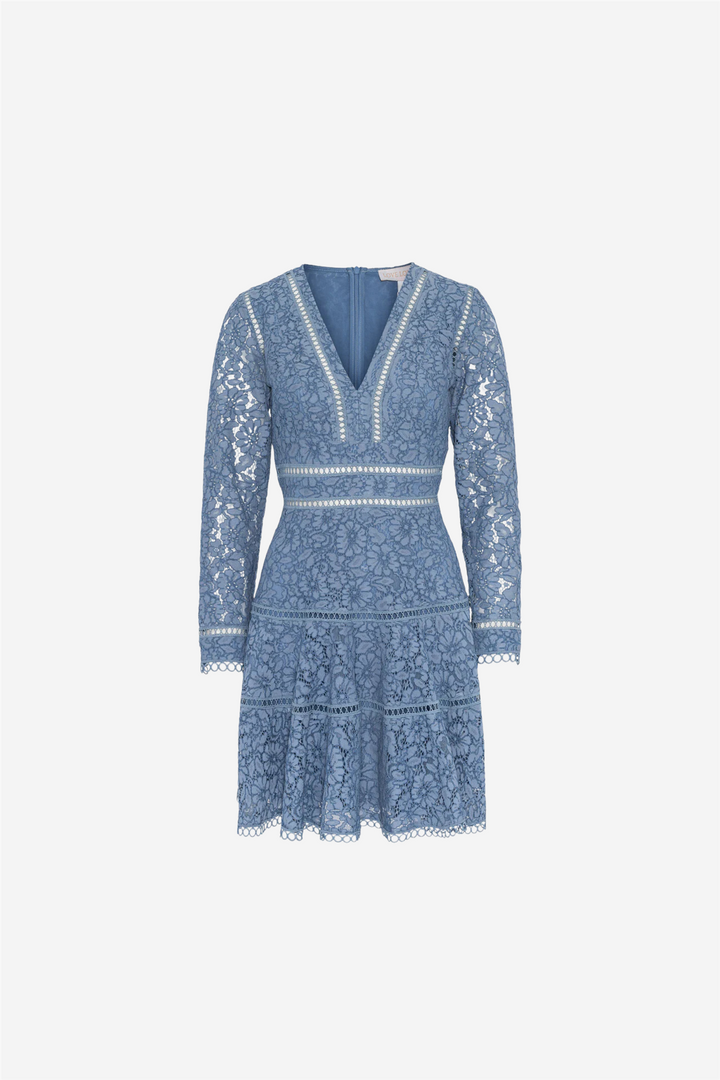 Ellie Mini Dress fra Love Lolina. En romantisk minikjole i delikat lyseblå blonde, designet med feminin V-utringning, markert midje og bølgete kanter. Et drømmende plagg som passer like godt til dagtidseventer som til spesielle anledninger.