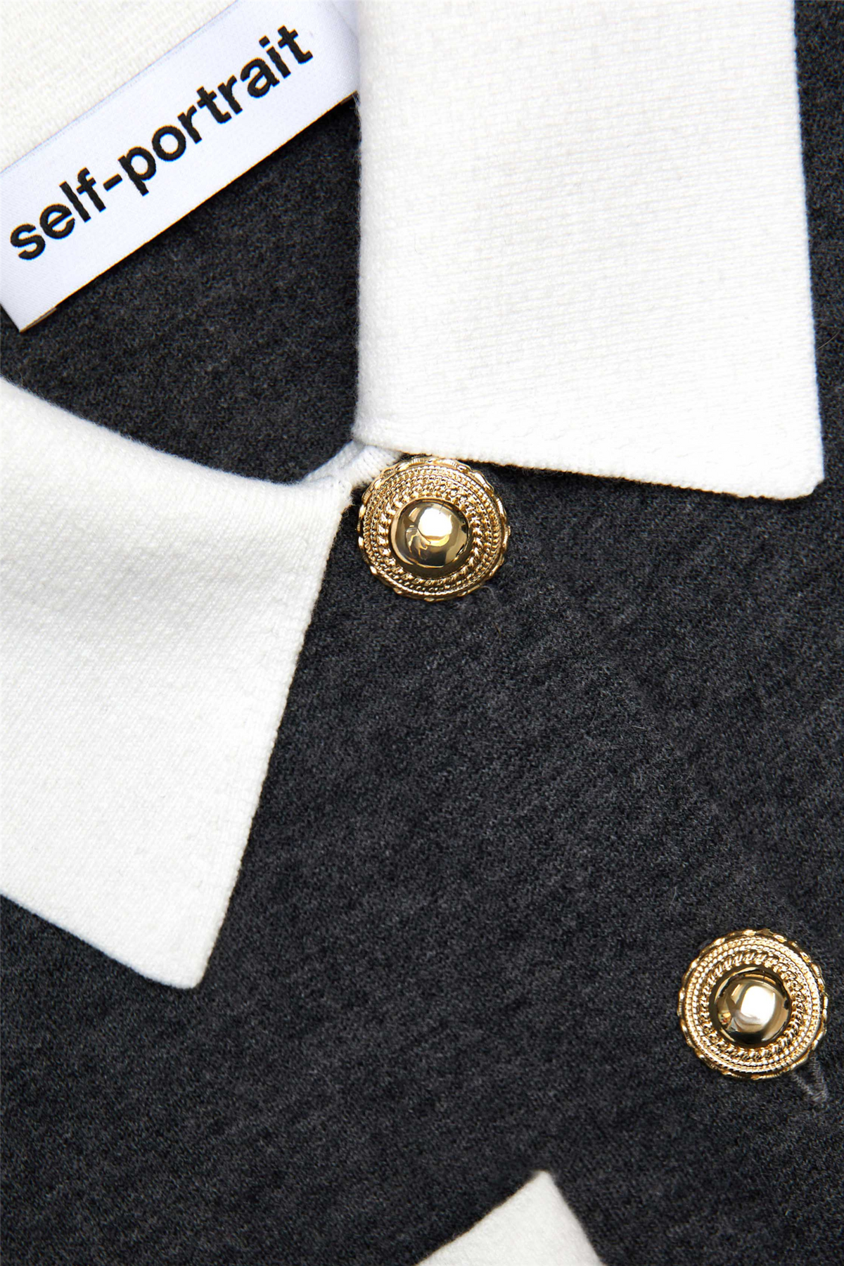 Gray Contrast Collar Cardigan from Self-Portrait. A relaxed twist on a preppy classic, this grey knit cardigan is decorated with contrasting white trim and gold buttons. Style with denim for a casual look, or pair with a midi skirt for an office-friendly look.