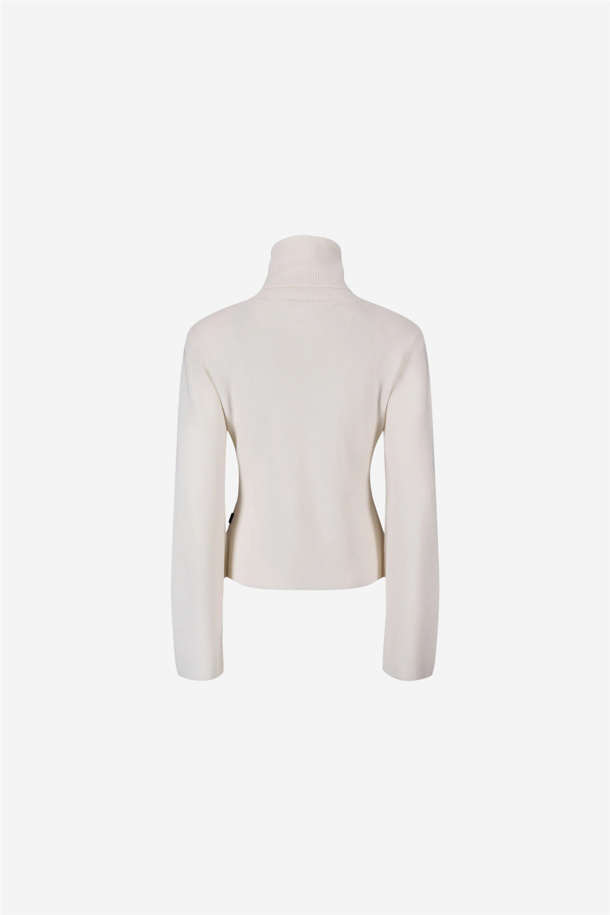 Poneh merino sweater from Ella&il. The Poneh Merino sweater has an elegant and versatile design with a straight fit and a slight waist curve for a feminine silhouette. The wide sleeves and comfortable turtleneck add a modern touch, while the removable shoulder pads allow for a customized look. Perfect for both everyday and more dressed-up outfits, this sweater combines comfort and style, making it a wardrobe staple.
