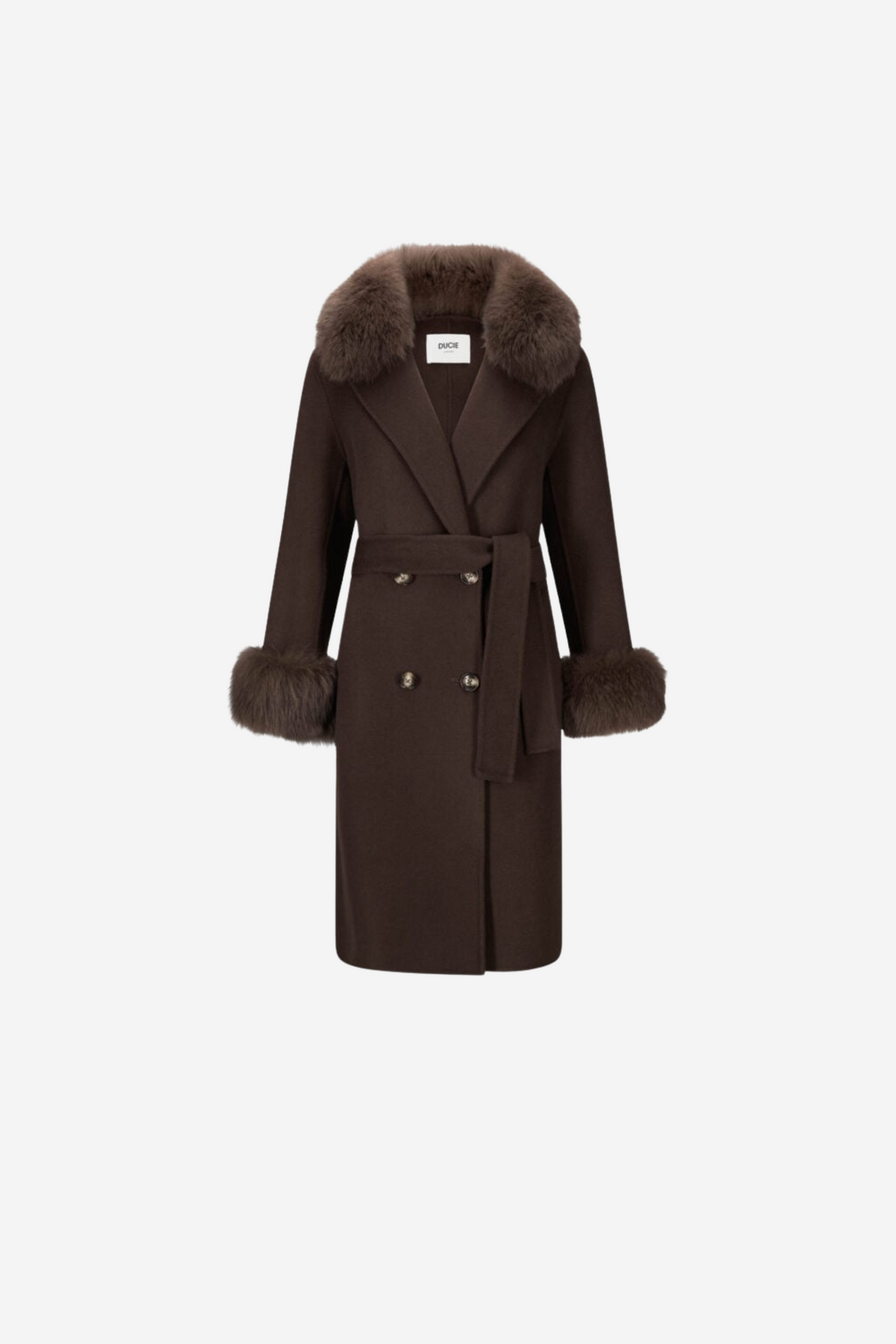 Ducie Marta Coat er en elegant og klassisk kåpe fra Ducie i ull. Kåpen sitter fantastisk på, med knappe lukking og belte i midjen. Detaljert med pels på kragen og rundt ermene.