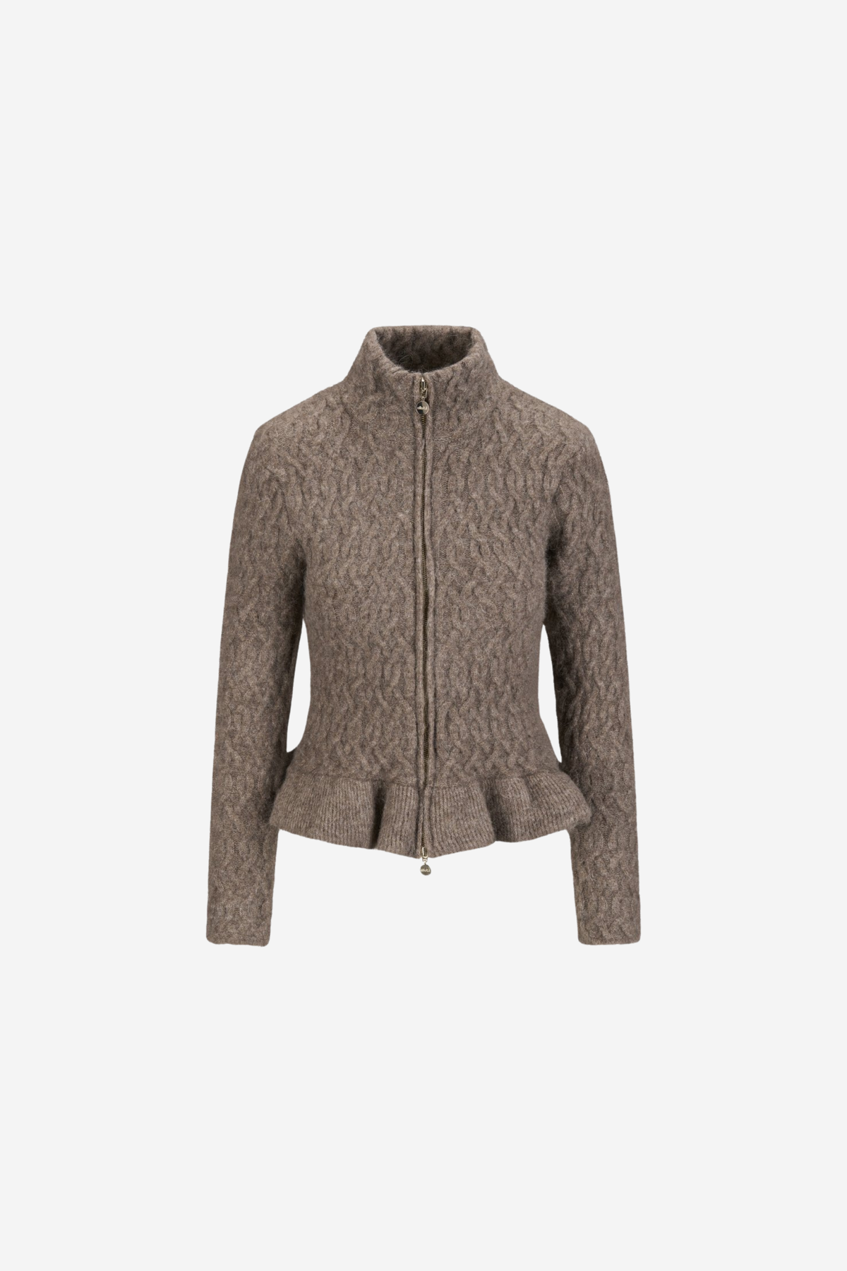 Lene Alpaca Cardigan fra Ella&il. Lene Alpaca Cardigan er et stilfullt og varmt plagg med lange ermer og høy hals. Den har volangdetaljer nederst og intrikate flettemønstre som tilfører tekstur og sjarm. De avtagbare skulderputene gir allsidighet, og den toveis glidelåsen foran øker funksjonaliteten. Denne cardiganen er perfekt for lag-på-lag-antrekk, og kombinerer komfort med et moteriktig uttrykk.