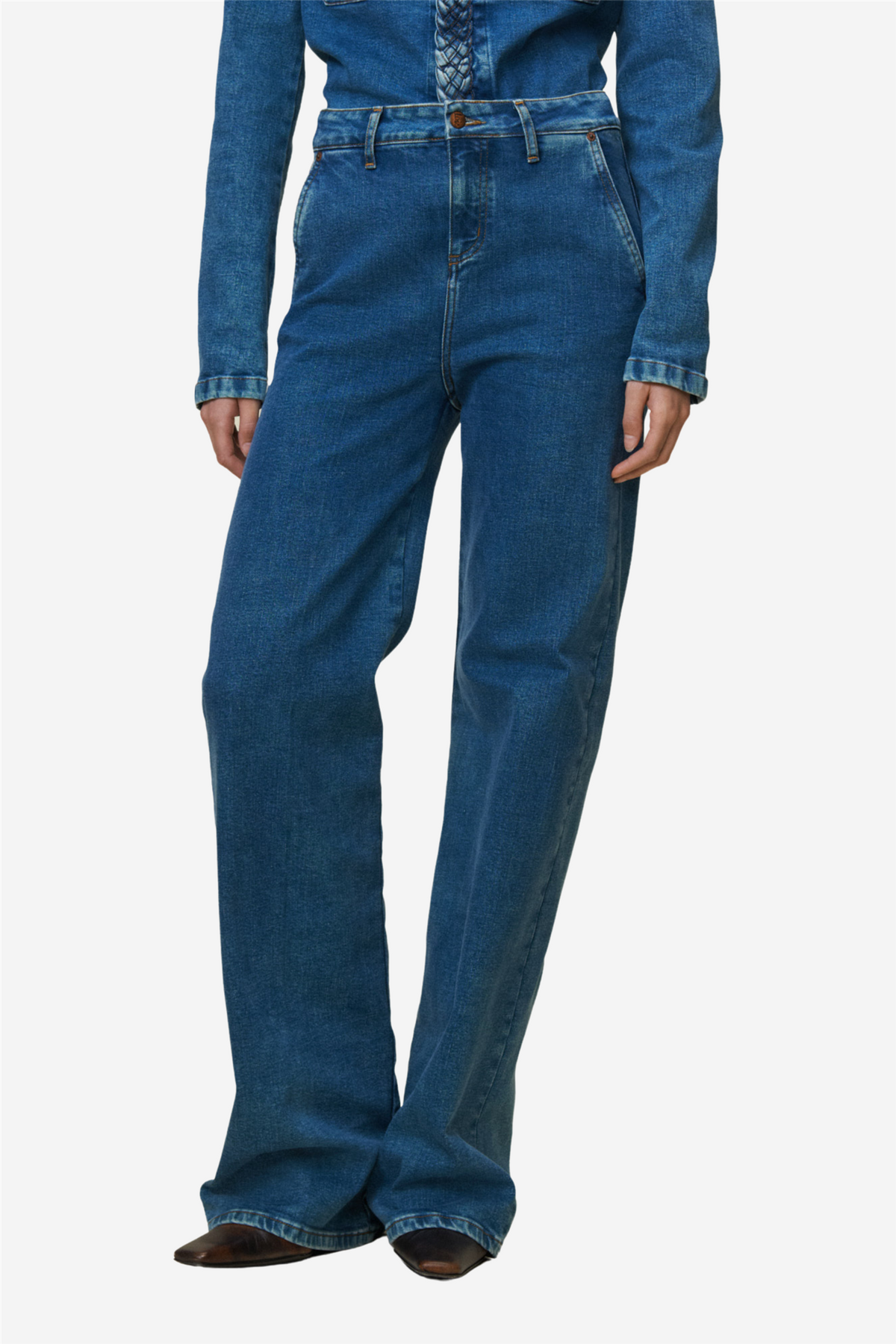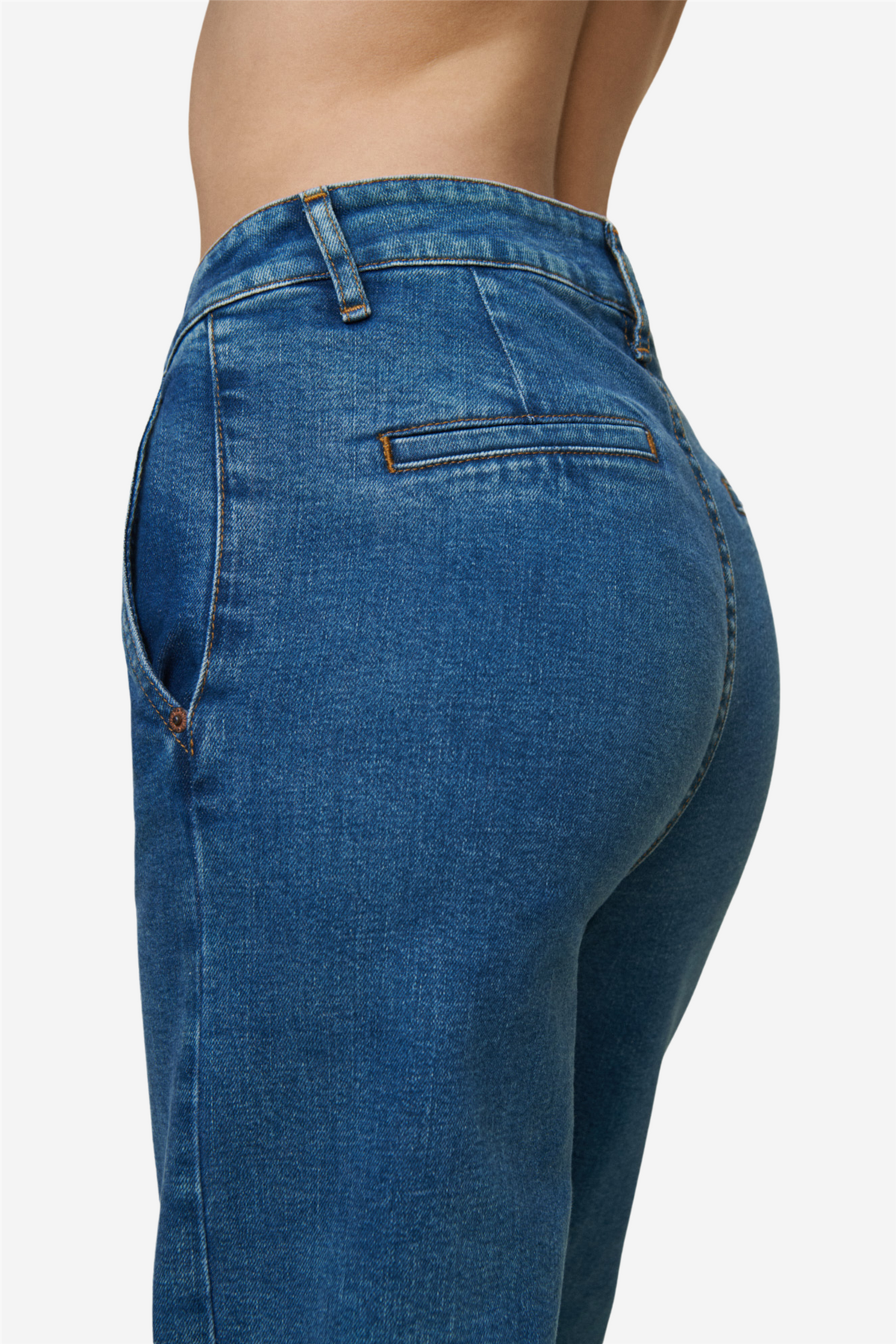 Silvia The is a sophisticated chino jeans with a flare. The pants have a high waist, welt pockets and stretch fabric. They have flared legs and are part of Lois' Bio Denim collection.