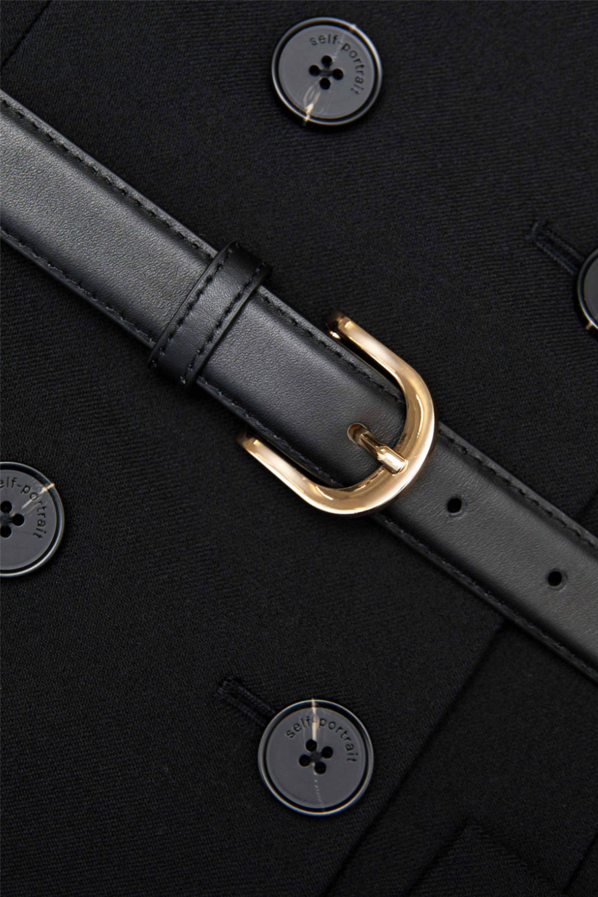 Kjolen har en figurnær passform, knapplukking i front og et avtagbart belte som fremhever midjen. Skulderputene er faste for å bevare den skarpe fasongen.