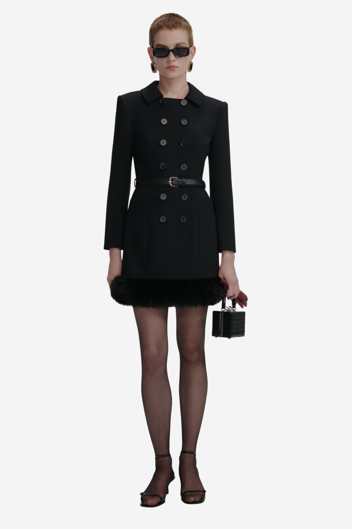 Black Wool Double Breasted Mini Dress fra Self-Portrait. En sofistikert kjole med en skreddersydd silhuett og dobbeltspent front. De markerte skuldrene gir et strukturert uttrykk, mens den glamorøse faux fur-kanten nederst tilfører en leken og luksuriøs touch. En perfekt miks av klassisk eleganse og moderne edge – like fin med både flats og hæler.