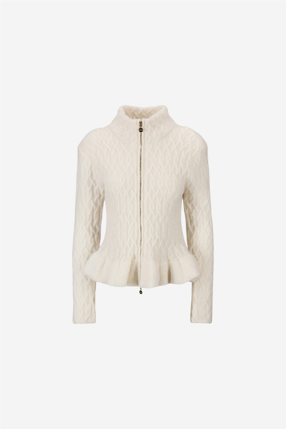 Lene alpaca cardigan from Ella&il. The Lene Alpaca Cardigan is a stylish and warm piece with long sleeves and a high neck. It features ruffle details at the hem and intricate braiding patterns that add texture and charm. The removable shoulder pads provide versatility, and the two-way front zipper increases functionality. Perfect for layering, this cardigan combines comfort with a fashionable look.