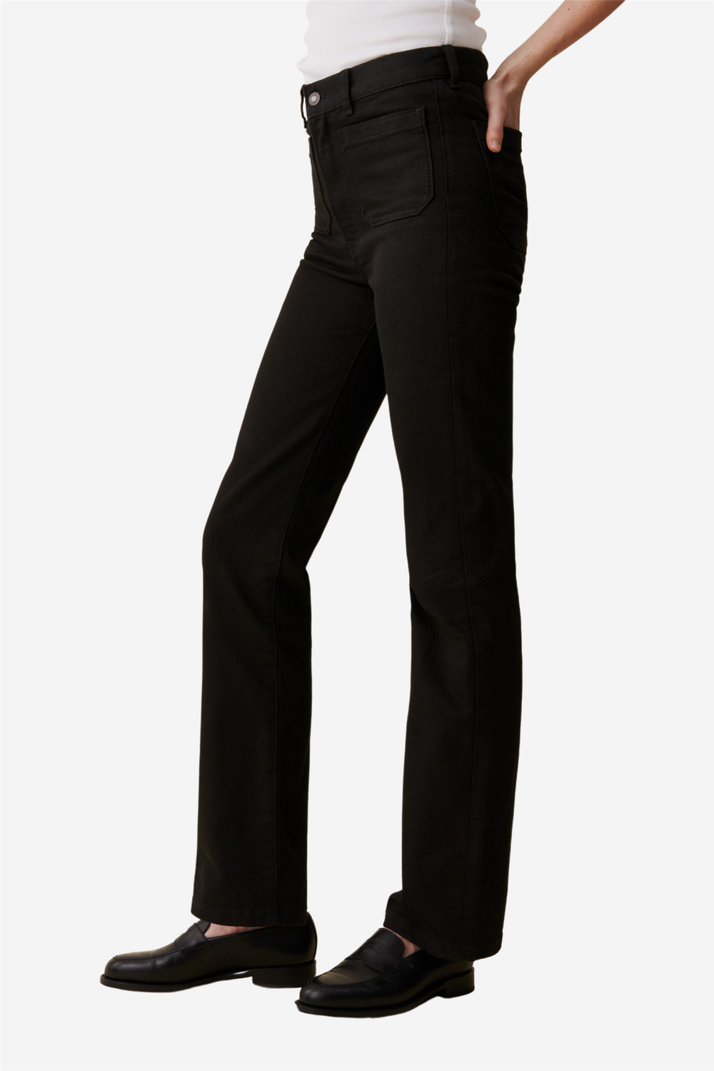 Alta Jeans is a pair of jeans with a vertical silhouette and 1970s-inspired patch pockets. These jeans feature a zip fly, high waist and slim thighs that fall into a straight leg. Made in a deep black wash with Jeanerica's signature stretch.