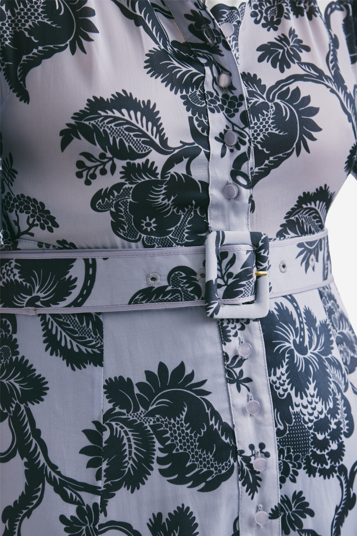 Organza Midi Dress frs By Timo is an elegant and slightly transparent dress made from FSC-certified viscose. The dress has a mid-length, stand-up collar and a defined waist that creates a feminine silhouette. It has short, square sleeves, buttons at the front and comes with a loose, matching belt for extra styling options.