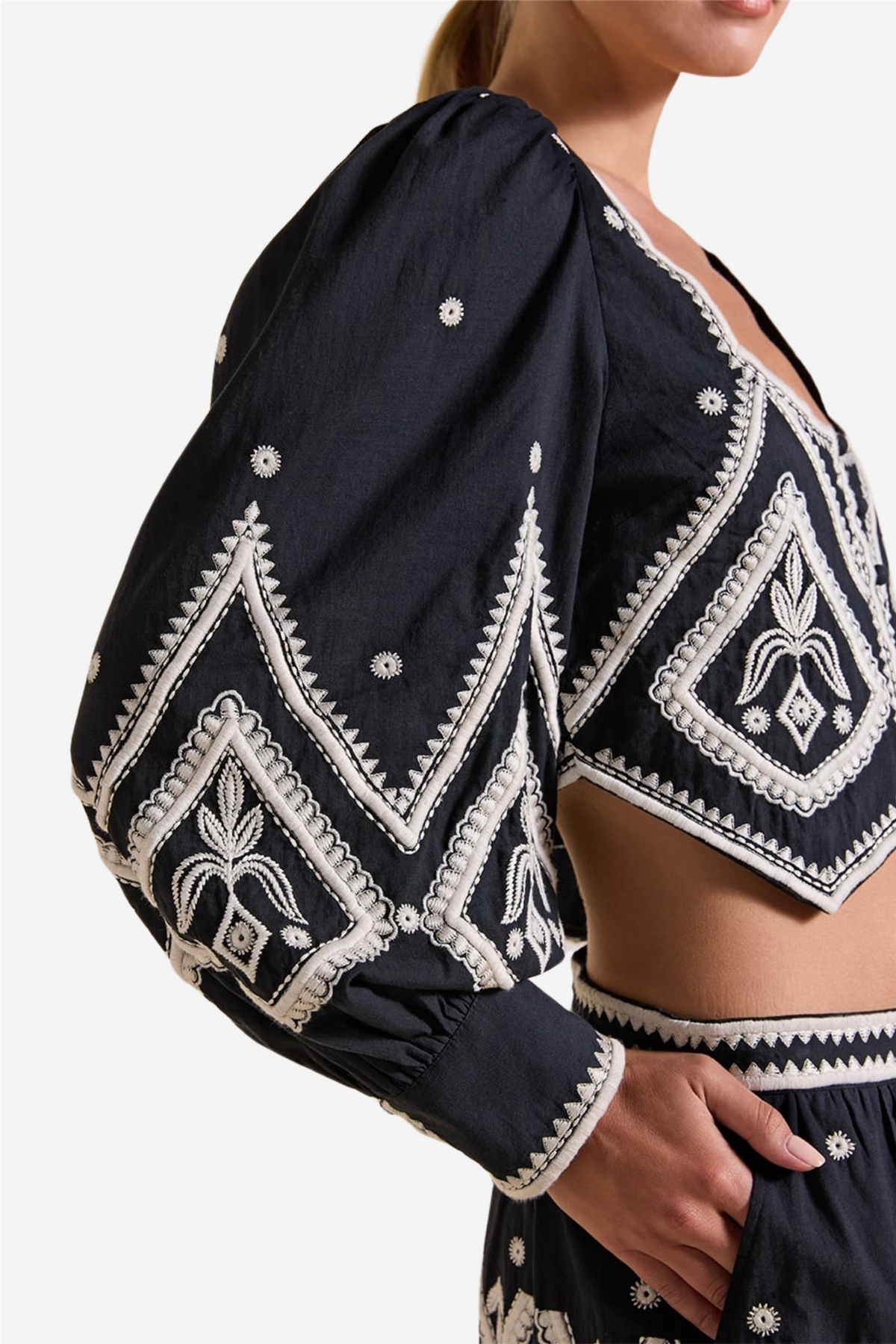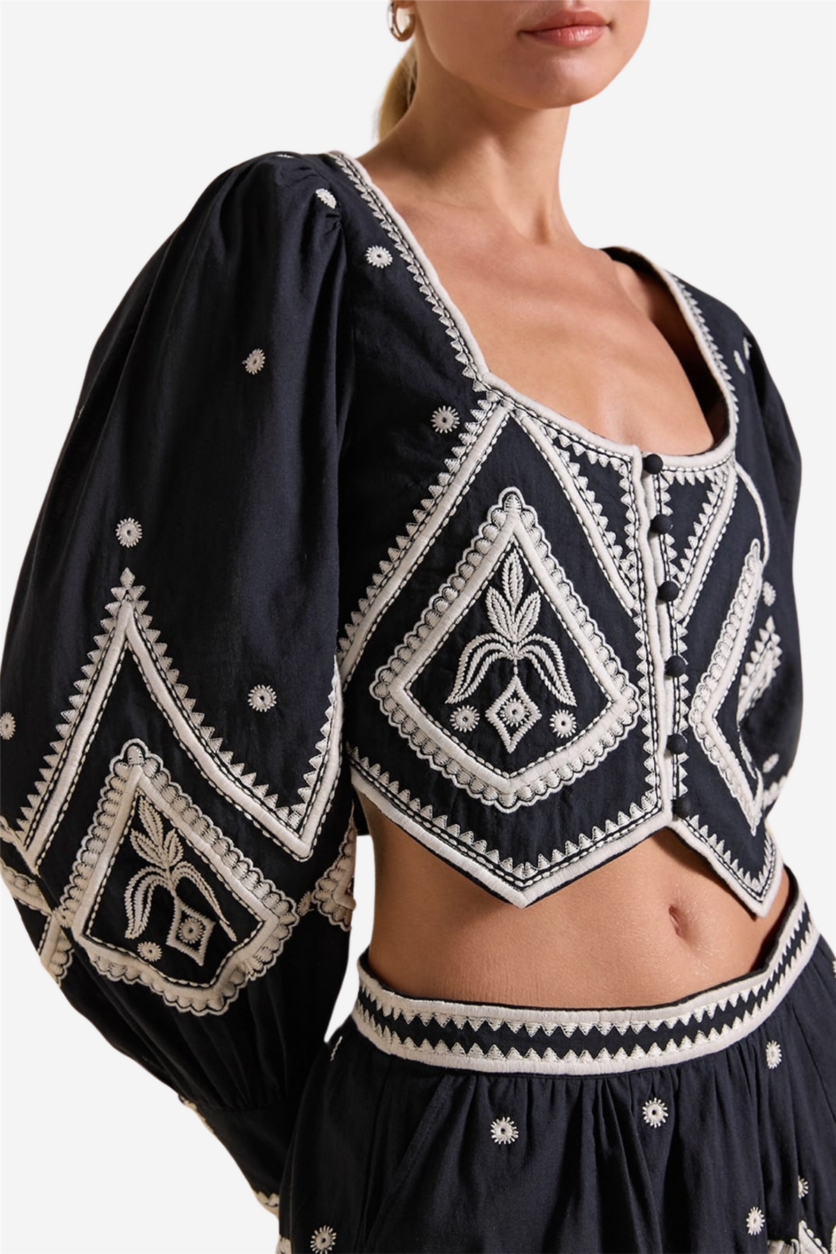 Madilyn Top from Scarlett Poppies combines hand-embroidered embroidery with a modern silhouette. This top features delicate embroidered details that add a refined touch to the minimalist design. Pair it with the matching, flowy skirt from the collection for a balanced, stylish outfit.