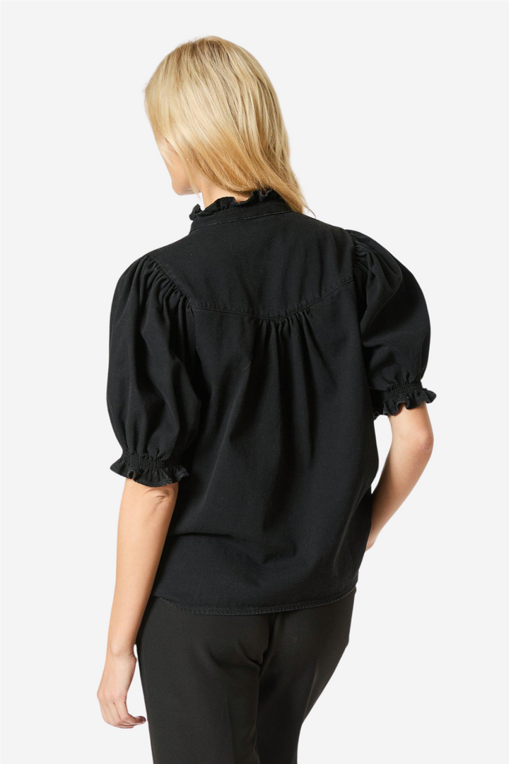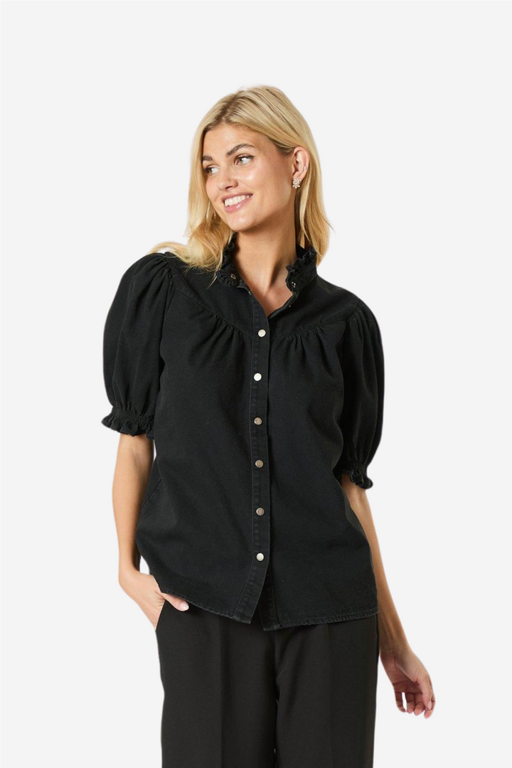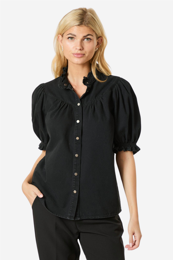 Avalon Denim Shirt from Neo Noir. Cute denim shirt with short puffed sleeves and button closure at the front. The shirt has ruffles at the collar and is made in a nice quality. The model is 176 cm tall and wears size 36.