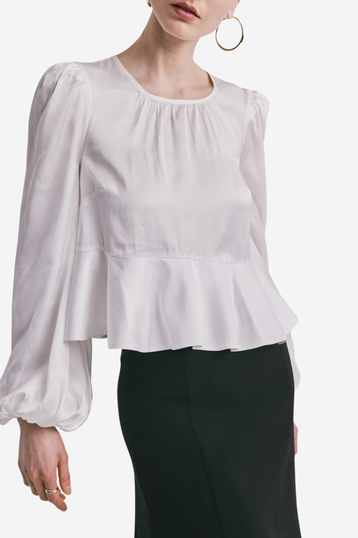 Satin Flounce Top fra By Timo er en elegant topp i blank og eksklusiv FSC-sertifisert viskose. Modellen har en avslappet passform med volang nederst som gir lett bevegelse, rund hals og lange ermer med elastiske mansjetter. En dyp nøkkelhullåpning i ryggen lukkes med en liten knapp for en feminin og sofistikert finish.