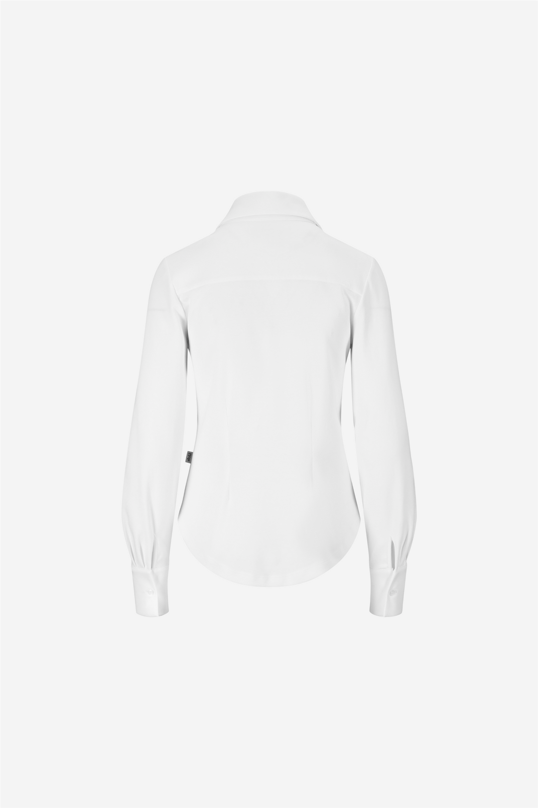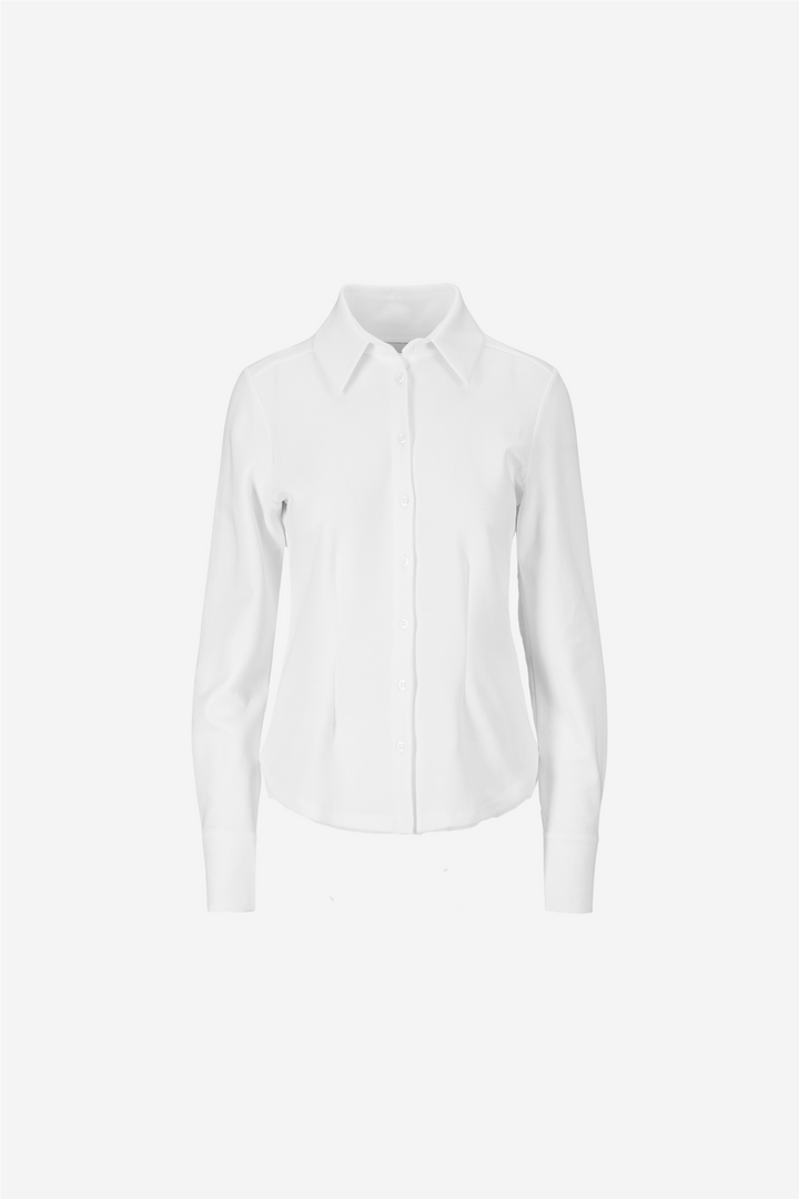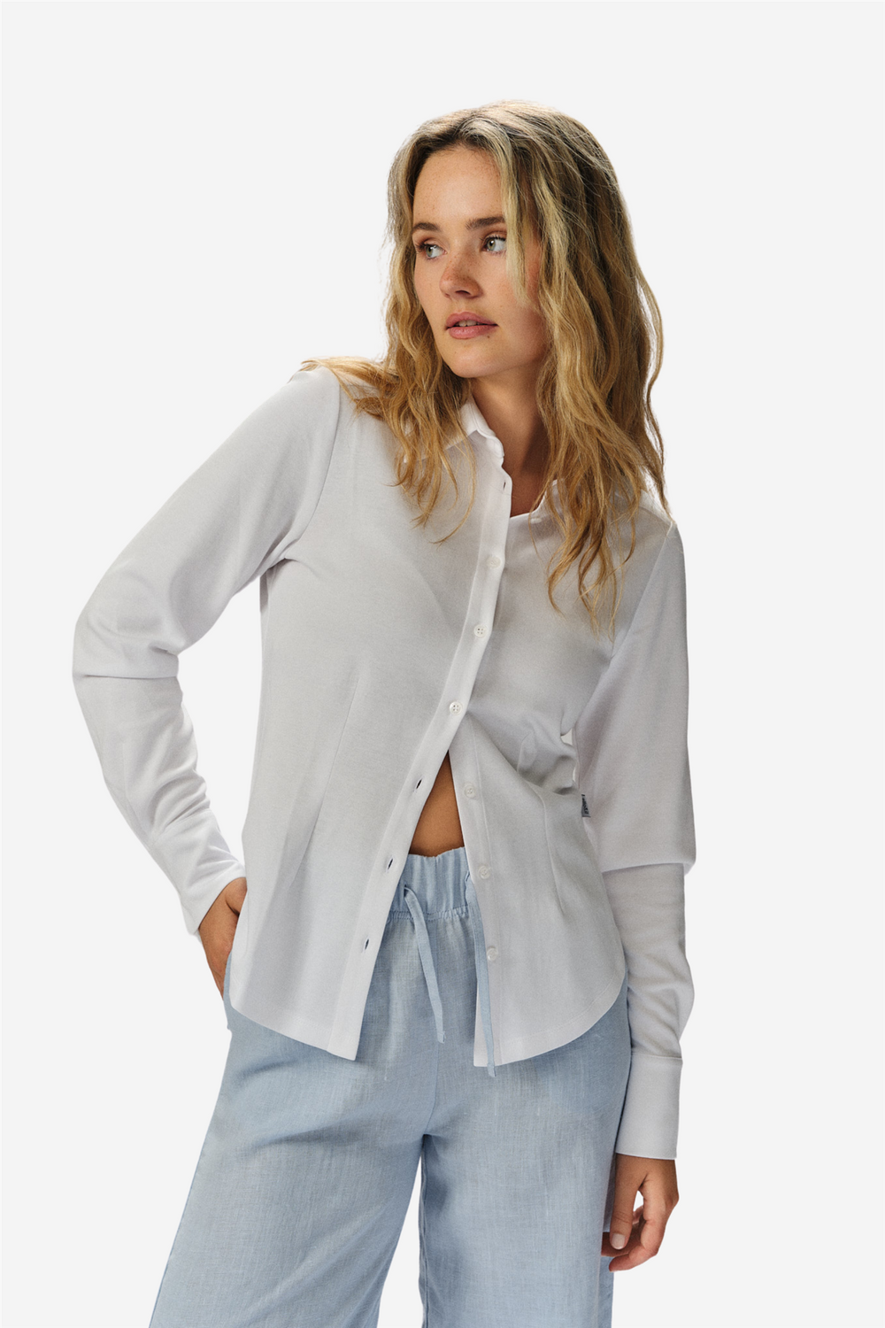 Odea Shirt from Ella&il is a modern update on the classic shirt, designed with a feminine touch. Made from soft cotton jersey, it offers a fitted silhouette, enhanced with elegant herringbone seams at the front and back. The high collar and front button placket add sophistication, while the keyhole detail at the cuffs provides unique, stylish details. Perfect for elevating both casual and formal outfits.