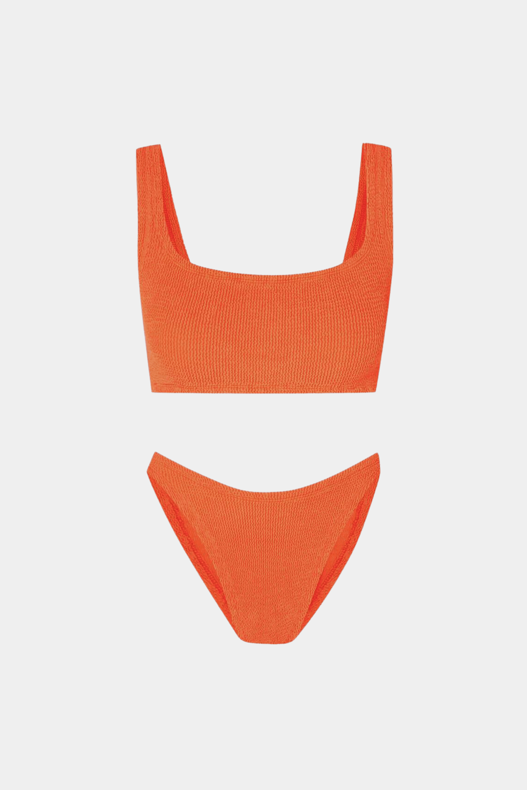 Hunza G Xandra Bikini is a classic and elegant bikini with a square neckline and thick shoulder straps. Classic all-covering bikini briefs. It comes in a crinkled seersucker finish. The bikini comes in one size with a lot of stretch to suit every body!