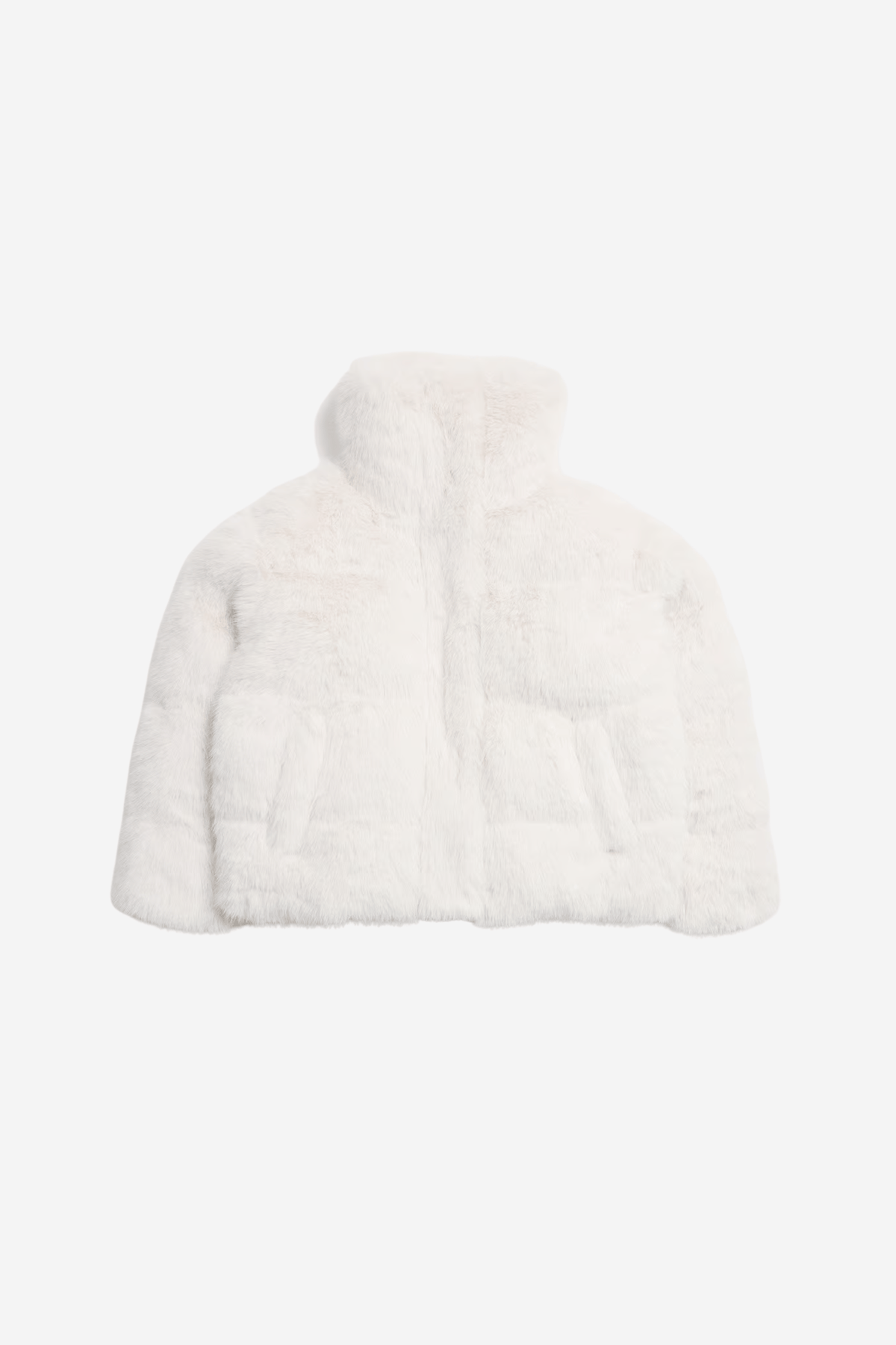 Steilia FauxFur Down Jacket fra Holzweiler. En nytolkning av den klassiske Steilia – denne gangen i ultramykt fuskepels. Jakken har RDS-sertifisert dunfyll, høy hals og praktiske detaljer som toveis glidelås, lommer og justerbar snøring i livet.