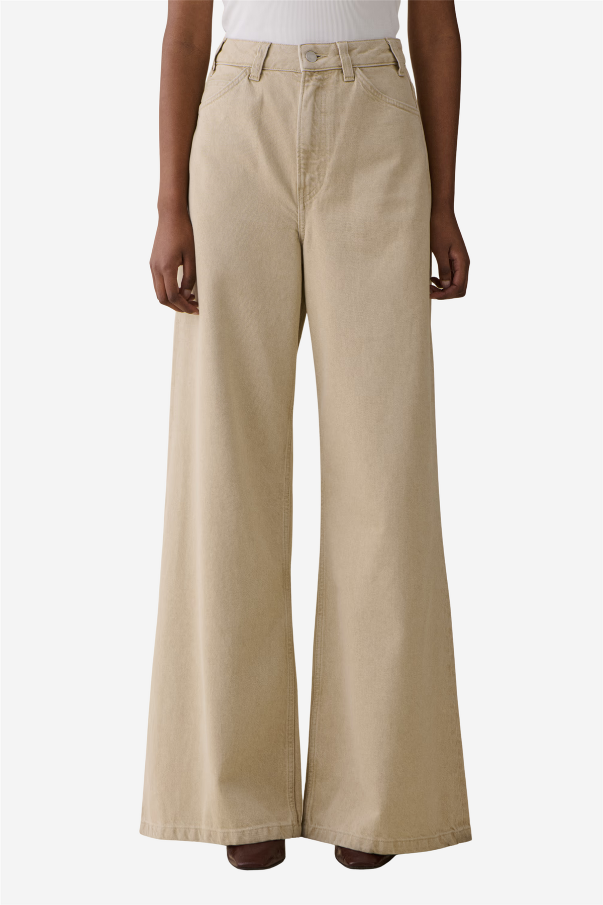 Alfama fra Jeanerica. Alfama jeansen har en avslappet, men sofistikert silhuett med høy midje og ekstra vide ben – en flatterende passform som skaper lengde og bevegelse. Denne varianten har en lett slitt finish med naturlig falming som gir buksen et mykt, vintagepreg.